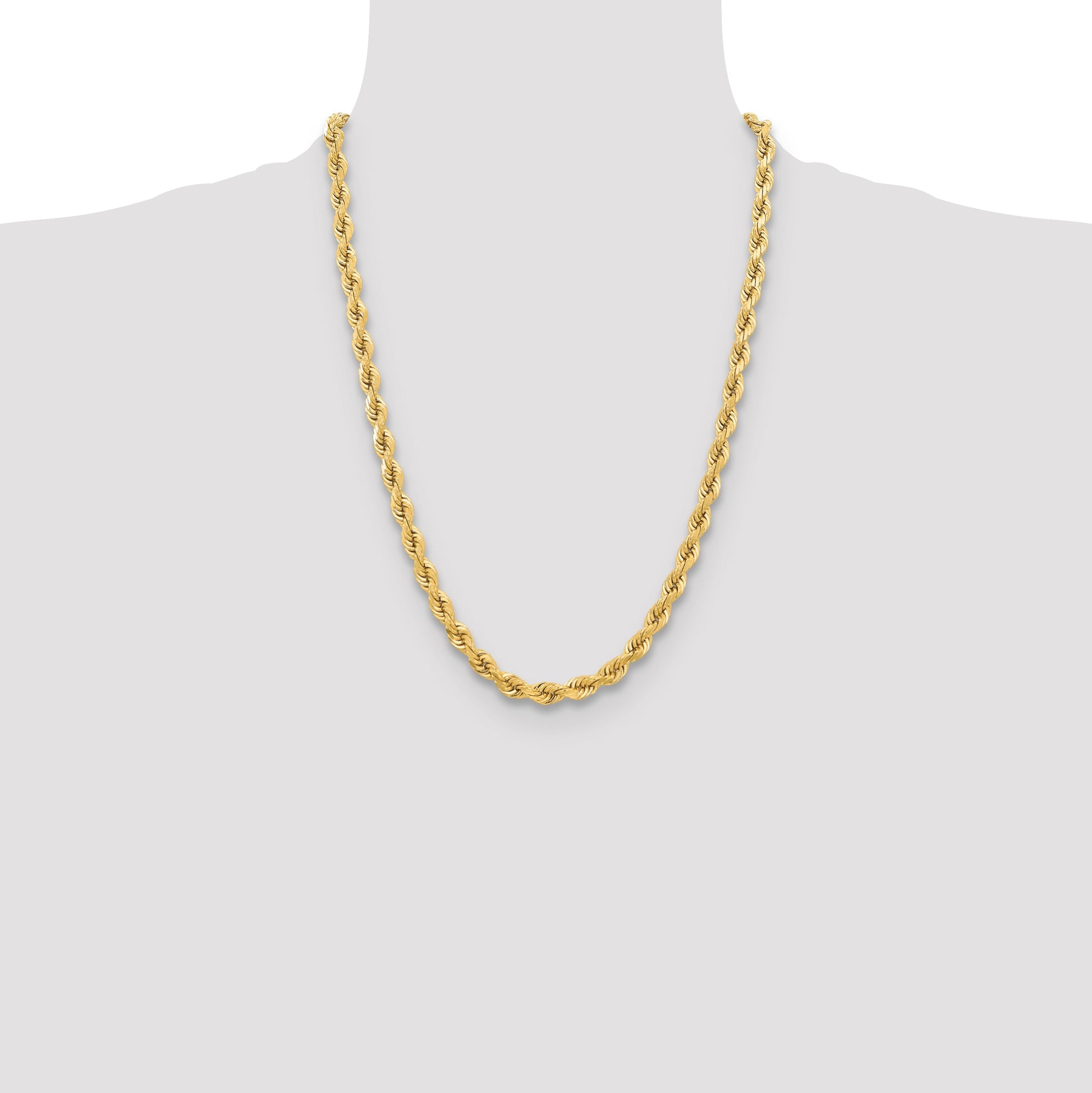 Introducing the stunning 10K Yellow Gold 6.5mm Diamond-Cut Rope Chain, a must-have for any jewelry collection. This exquisite chain boasts a polished finish that gleams in the light, perfect for adding a touch of luxury to any outfit. At 24 inches in length, it's the ideal size for both casual and formal wear. This rope chain features a solid construction with a 6.5mm width providing durability and a sophisticated style. The refined diamond-cut texture enhances the yellow gold's brilliance, while a fancy lobster clasp ensures secure wear. Elevate your ensemble with the elegance of this outstanding 10K Yellow Gold 6.5mm Diamond-Cut Rope Chain.