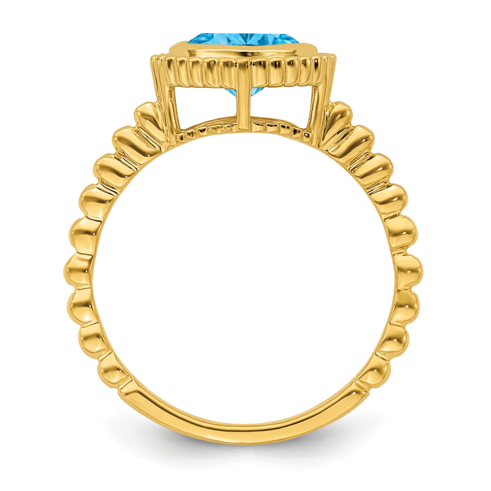 Discover the timeless elegance of the 10K Yellow Gold Cushion Blue Topaz Ring. This beautiful piece showcases a striking Swiss Blue Topaz gemstone, cut into a dazzling 6.5 mm cushion shape, weighing 1.35 carats. Its polished 10K yellow gold band gently tapers from 1.6 to 1.8 mm, perfectly framing the stone's enchanting blue hue. Sizes range from 6 to 8, with the ring's top measuring 10.9 mm for a balanced look. Though its craftsmanship allows resizing, engraving isn't recommended. The 10K Yellow Gold Cushion Blue Topaz Ring is a stunning testament to classic glamour, perfect for any occasion.