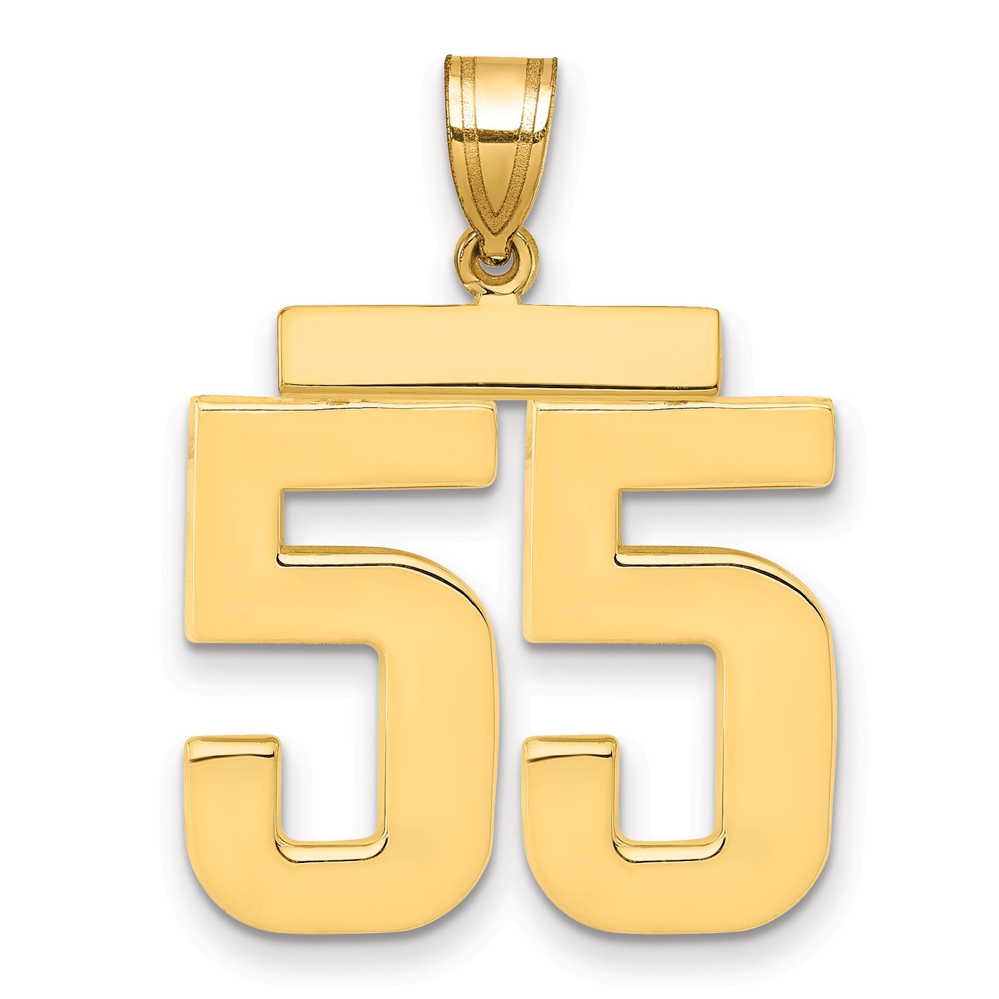 The 10K Yellow Gold Large Polished Number 55 Charm is a stunning piece that shines with simplicity and elegance. Crafted from solid 10K gold, its warm yellow hue captures attention and adds a touch of luxury to any ensemble. The charm's sleek, polished finish enhances its sophisticated appeal, making it ideal for wearing solo or as part of a charm collection. Whether marking an important milestone or simply celebrating a favorite number, the 10K Yellow Gold Large Polished Number 55 Charm offers timeless style and grace.