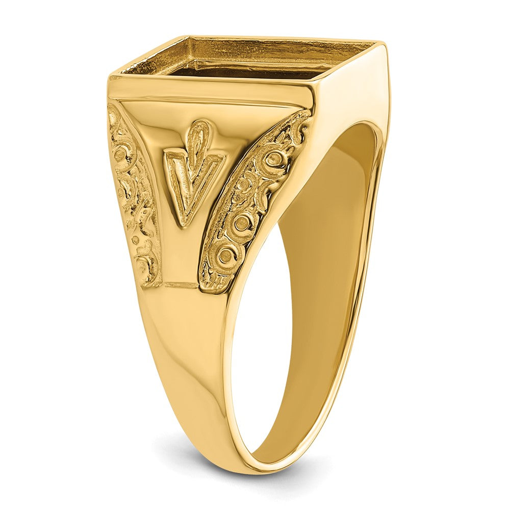 The 10K Yellow Gold Men's Polished and Textured Masonic Ring Mounting delivers a nod to timeless elegance. Crafted from 10K gold, its design seamlessly blends smooth polish with intricate texture. This ring offers a solid, durable base for your central stone, ideally housed in a rectangular 12.00 x 10.00 mm setting. The tapered band, ranging from 2.75 to 13.6 mm, ensures a snug fit, embracing modern style with a nod to tradition. Perfect for men who value understated luxury, the 10K Yellow Gold Men's Polished and Textured Masonic Ring Mounting stands alone in sophistication.