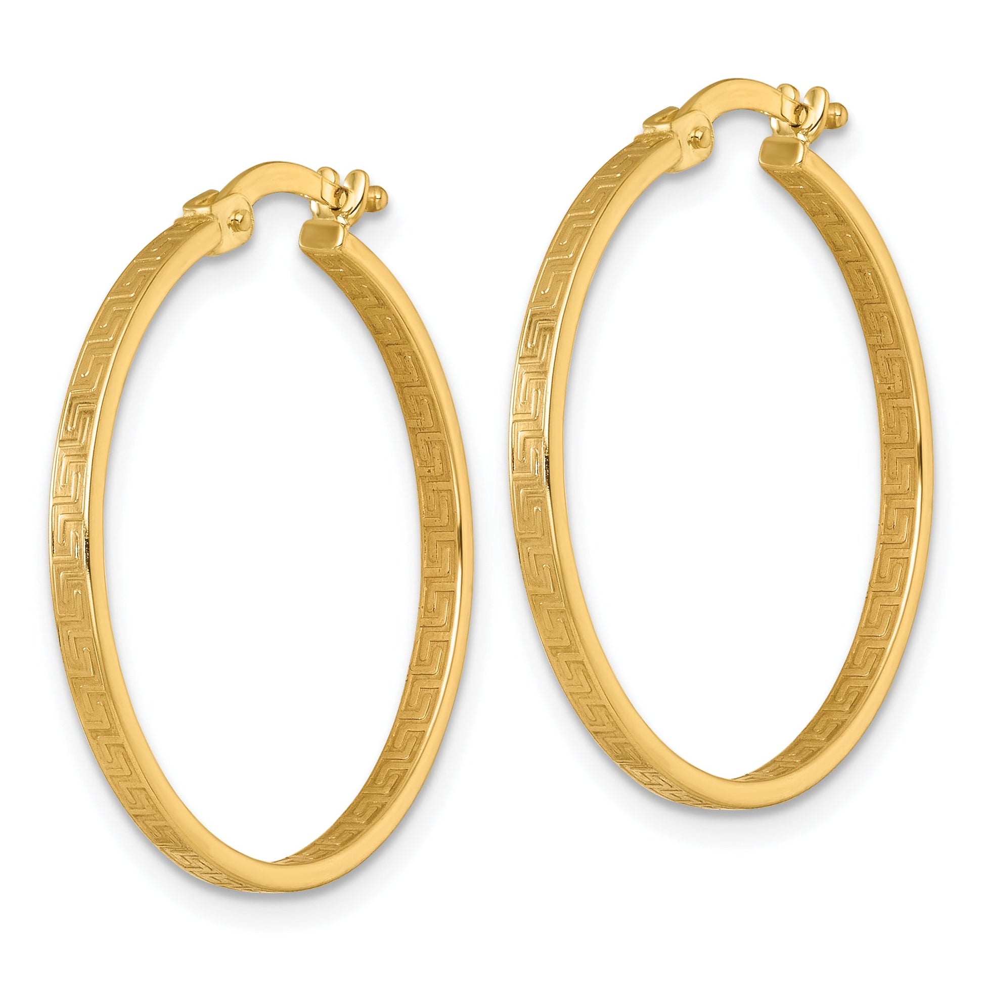Step into timeless elegance with our exquisite 10K Yellow Gold Polished Greek Key In/Out Square Tube Hoop Earrings. Meticulously crafted with a gleaming finish, these hoops boast a classic Greek key design etched into rich yellow gold. The 27mm wide, hollow structure keeps them light yet striking. Their unique in-and-out form adds depth, making them perfect for daily wear or special occasions. Securely fastened with a wire and clutch closure, these hoops are a flawless blend of style and sophistication. Elevate your jewelry collection with these extraordinary 10K Yellow Gold hoop earrings.