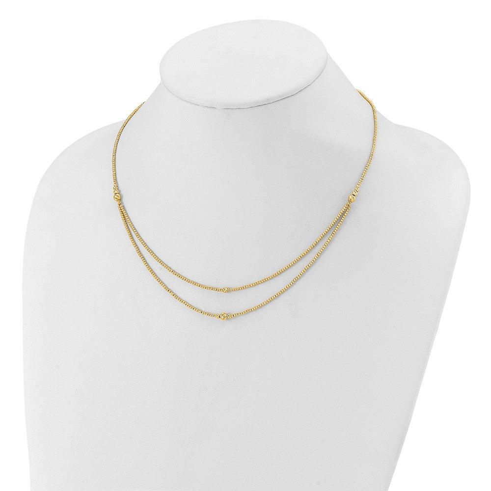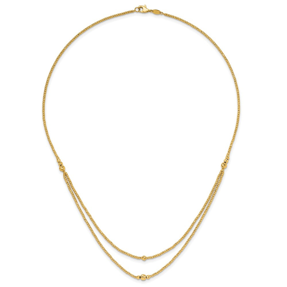 Add some sparkle to your style with the 10K Yellow Gold 10K Polished And Diamond-Cut Beads 2-Strand Necklace. Made from genuine 10K gold, this necklace offers a rich yellow hue and a polished shine that catches the eye. Its dual strands feature sparkling diamond-cut beads and beaded edges, creating a stylish layered look. At 18 inches long, it sits comfortably around your neck, perfect for daily wear or special occasions. The lobster clasp ensures a secure fit, while the lightweight design keeps you comfy all day long. The 10K Yellow Gold 10K Polished And Diamond-Cut Beads 2-Strand Necklace makes a timeless addition to any jewelry collection.