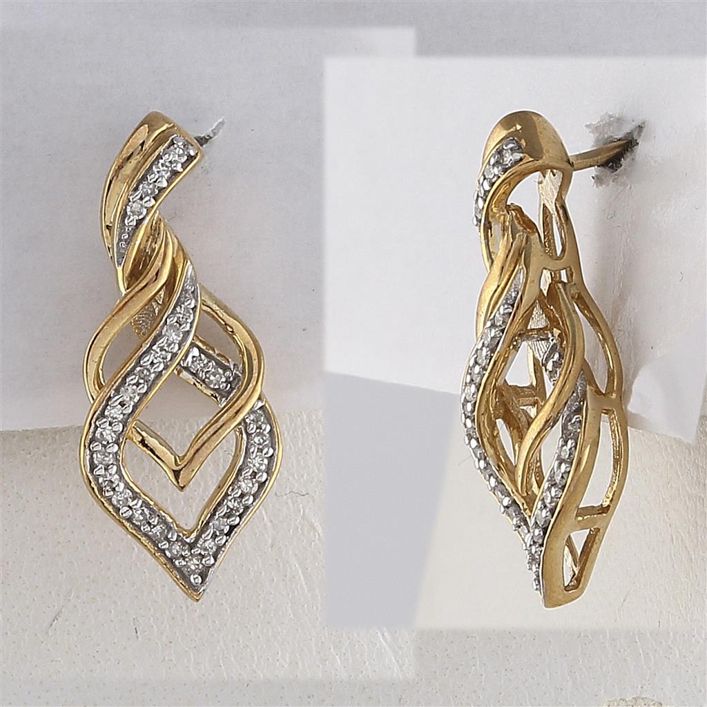 These stunning drop earrings, crafted from 10kt yellow gold, feature round diamonds with a combined carat weight of 1/5. The diamonds are prong-set and have a color range of G-H and clarity of I2. Weighing approximately 3.34 grams, these earrings are a true work of art that exude elegance and sophistication.