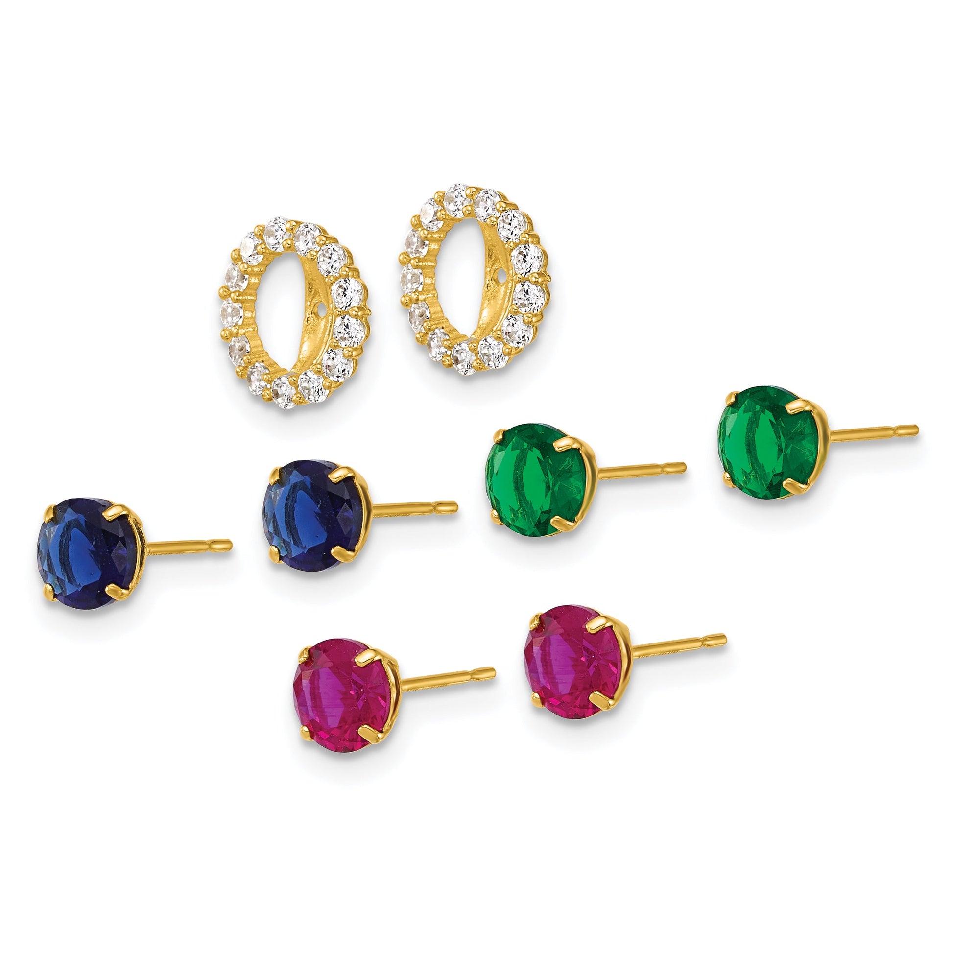 Discover the elegance of this 10K Yellow Gold Set of Three Stud Earrings, featuring vibrant red, blue, and green glass stones. Each earring boasts a halo of sparkling cubic zirconia diamonds that enhances the colorful stones. The polished yellow gold adds a touch of warmth and refinement. These earrings, featuring a secure post and push back closure, are designed for ease and comfort. Their unisex appeal makes them perfect for any fashion lover. Add a pop of style to your collection with this stunning 10K Yellow Gold Set with glass stone studs and a dazzling CZ halo design.