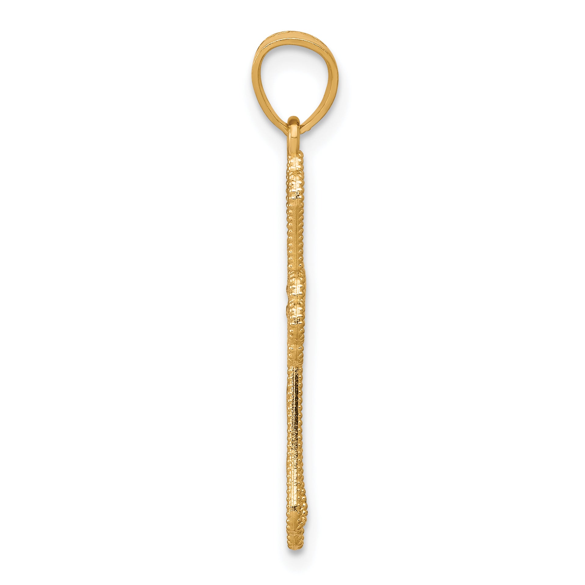 Introducing the 10k Yellow Gold with Rhodium Diamond-Cut Cross Pendant, a perfect blend of elegance and craftsmanship. This beautiful pendant, crafted from 10k yellow gold, features a stunning rhodium finish that adds a touch of sophistication. Measuring 30 mm in length and 16 mm in width, its polished surface catches the light brilliantly, enhancing its intricate diamond-cut design. This themed pendant is solid and durable, forged through precise casting techniques. The 10k Yellow Gold with Rhodium Diamond-Cut Cross Pendant is a timeless treasure, ideal for any jewelry collection.