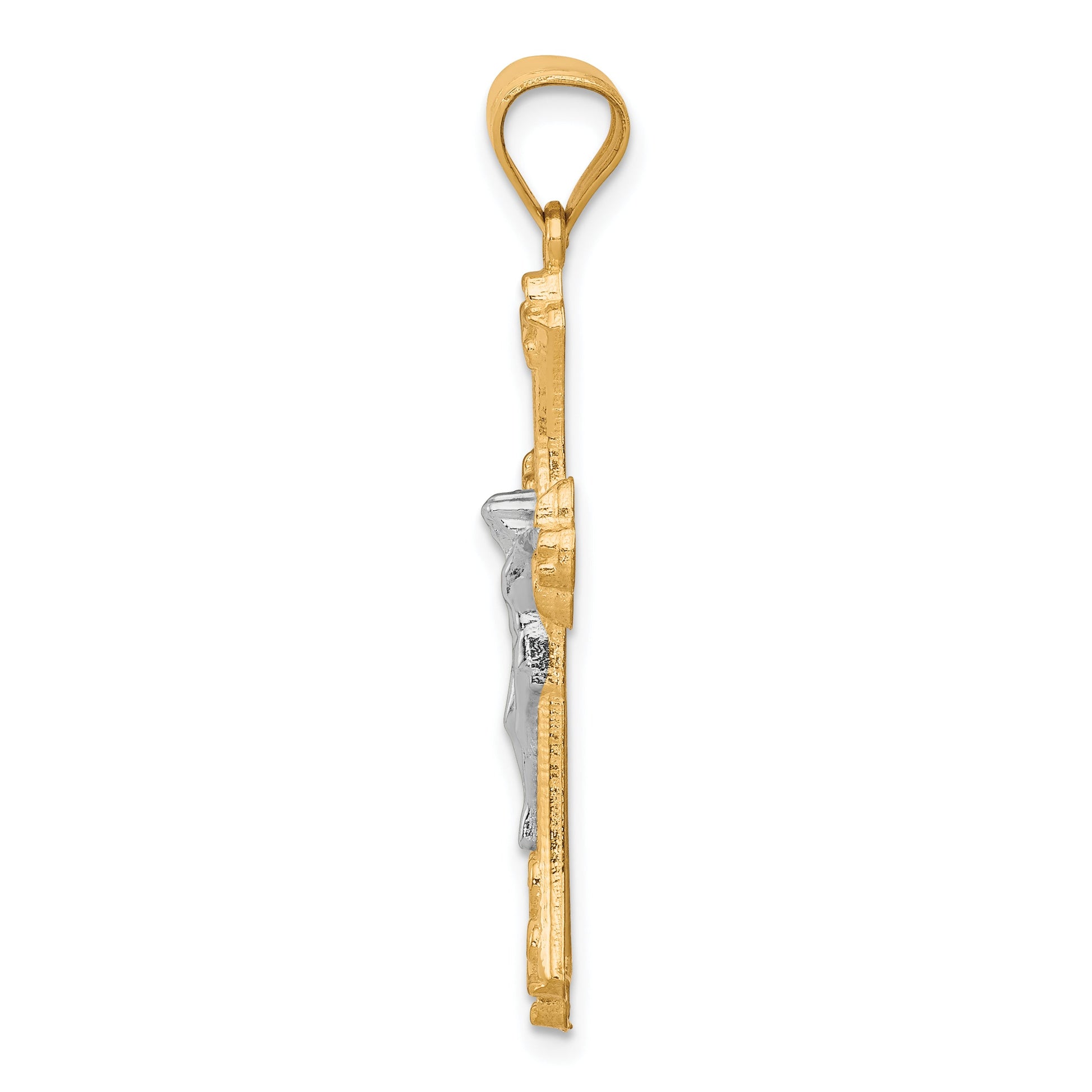 Elevate your style with the 10K Yellow Gold with Rhodium Fleur De Lis Crucifix Pendant. Crafted from polished 10K yellow gold, this stunning piece features delicate rhodium accents, adding a touch of elegance. The pendant measures 35 mm long, with intricate Fleur De Lis detailing extending 30.34 mm in length and 19.22 mm in width. Solidly cast for durability, this pendant is a timeless addition to any jewelry collection. The 10K Yellow Gold with Rhodium Fleur De Lis Crucifix Pendant effortlessly combines classic beauty and enduring quality.