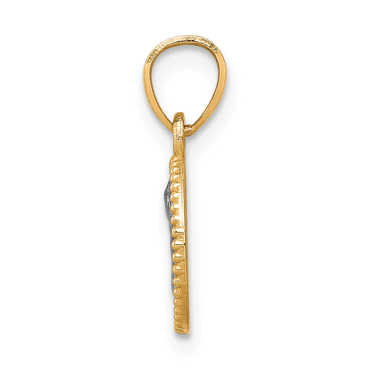 Introduce a touch of celestial charm with our 10k Yellow Gold and Rhodium Angel Pendant. Crafted with precision, this polished and textured piece captures the beauty of an angel, measuring a delicate 16.19 mm in length. The pendant features primary yellow gold accented with white rhodium, enhancing its radiant appeal. Each 9.5 mm charm element showcases exquisite detailing, making it a standout addition to any jewelry collection. Whether for daily wear or a special occasion, the 10k Yellow Gold and Rhodium Angel Pendant adds a divine sparkle to your ensemble.