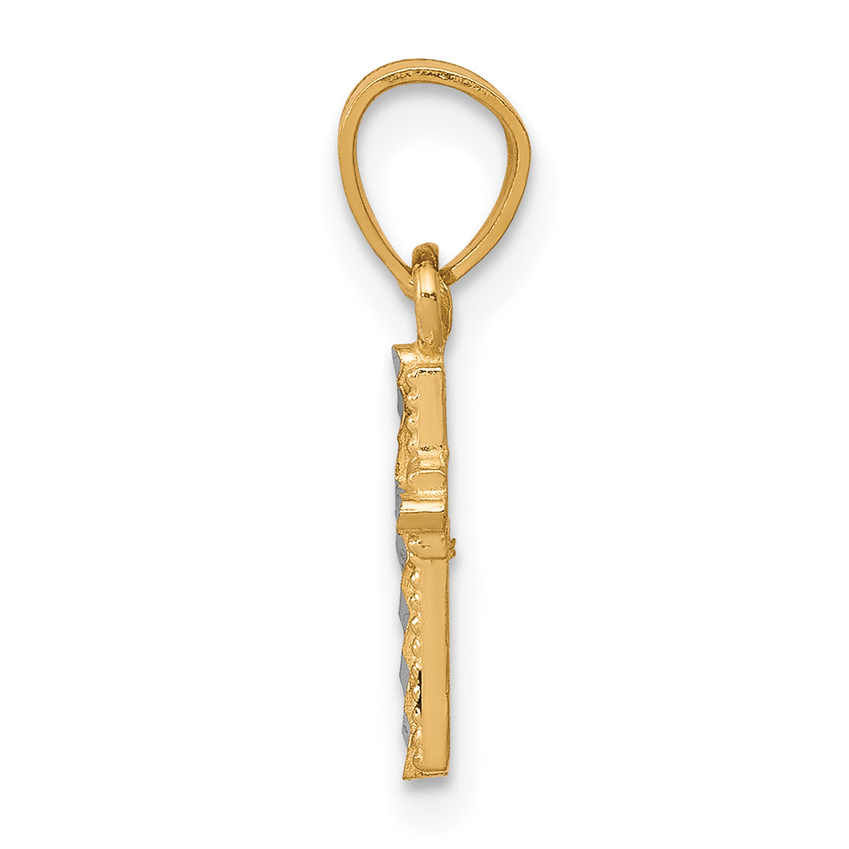 Discover the elegance of our 10k Yellow Gold with Rhodium Tiny Diamond-Cut Cross Pendant. This exquisite piece boasts a polished finish and measures 16 mm in length and 7 mm in width, offering a delicate yet striking appearance. Crafted from high-quality gold with rhodium accents, this solid pendant shines with a refined white hue. Perfect for any occasion, this themed charm adds a touch of sophistication to your collection. Upgrade your style with our 10k Yellow Gold with Rhodium Tiny Diamond-Cut Cross Pendant and make a timeless statement.