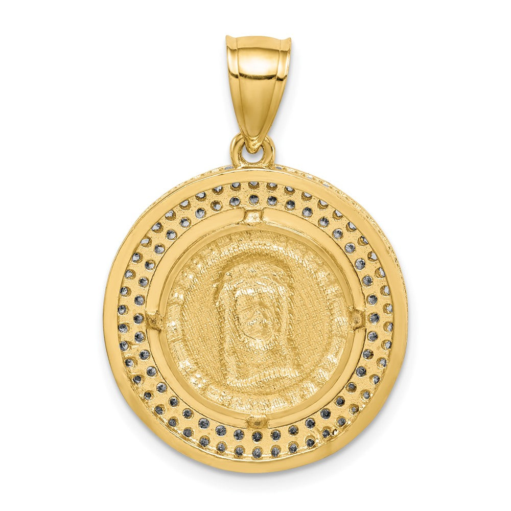 Introducing an exquisitely crafted 10k Yellow Gold w/Rhodium CZ Channel Edge Pave Jesus Face Pendant that is sure to enchant any jewelry lover. This stunning piece features a polished finish and is accented with elegant rhodium and sparkling Cubic Zirconia stones. Measuring 30.05 mm in length, this solid piece weighs 3.59 GM and boasts a charming Jesus face design, with a length of 21.11 mm and a width of 20.96 mm. Made with high-quality synthetic materials, this pendant is a testament to exceptional craftsmanship and is perfect for any occasion. Whether you're buying it for yourself or as a gift, this beautiful jewelry piece is sure to make a lasting impression.