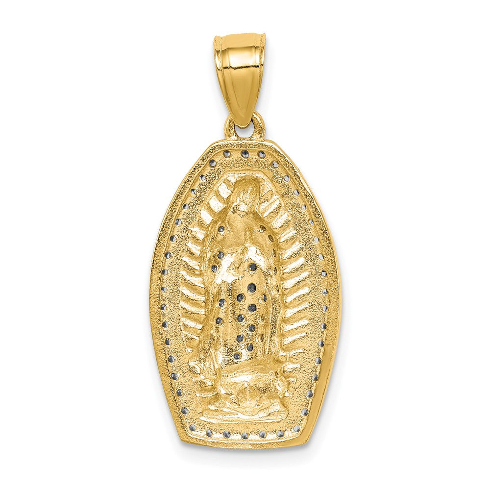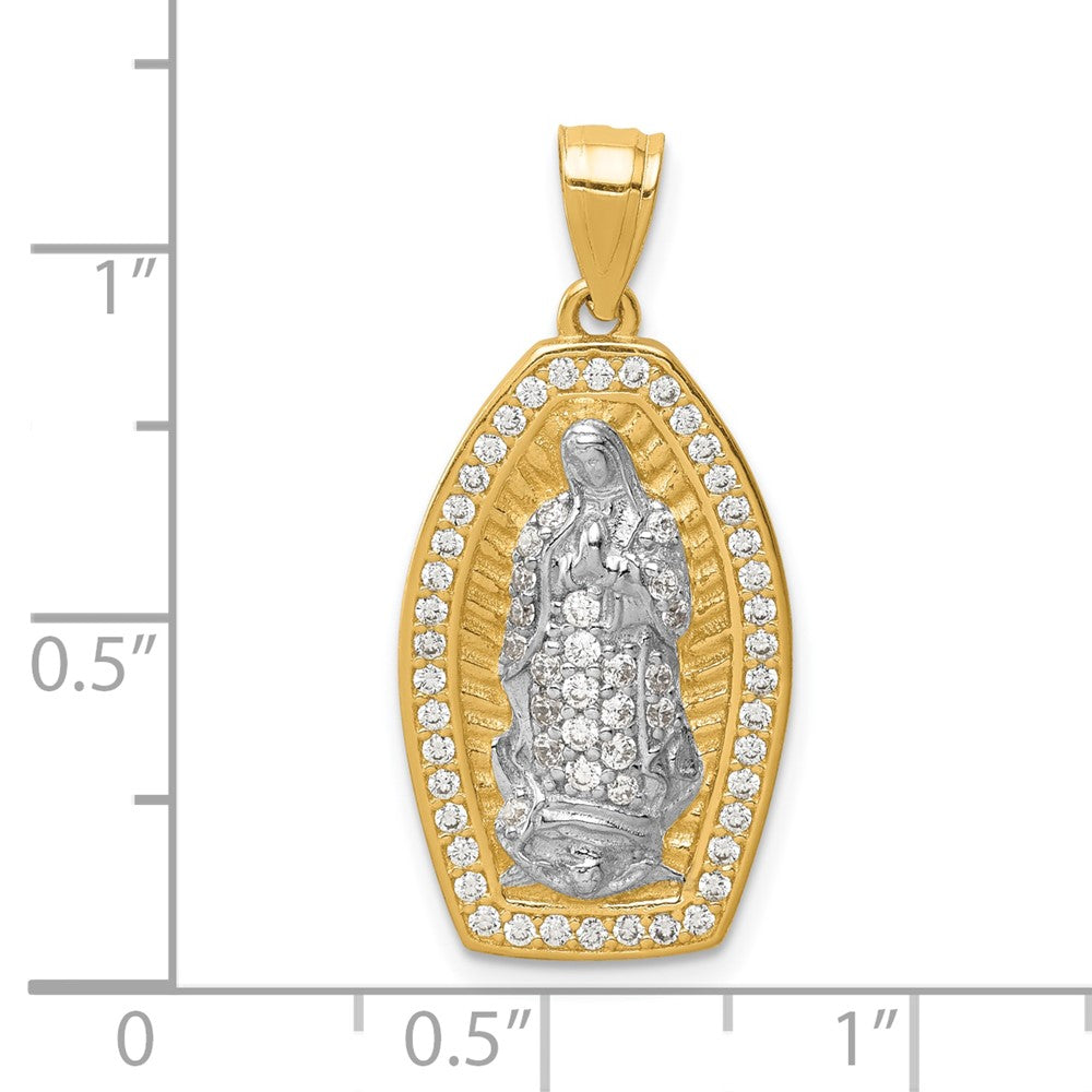 In search of a stunning piece of jewelry to add to your collection? Look no further than this 10k Yellow Gold w/Rhodium CZ Micropave Guadalupe Pendant. Made of high-quality 10k yellow gold with rhodium, this pendant has a polished finish that gleams in the light. It features sparkling cubic zirconia stones that are micropaved in place, adding a touch of brilliance to the already-beautiful piece. Measuring 28.57 mm in length and with a weight of 2.8 grams, this pendant is solidly constructed and built to last. The white rhodium material accents provide a striking contrast to the warm, golden hue of the yellow gold. This pendant is perfect for everyday wear or for special occasions when you want to make a statement. Add it to your collection today!