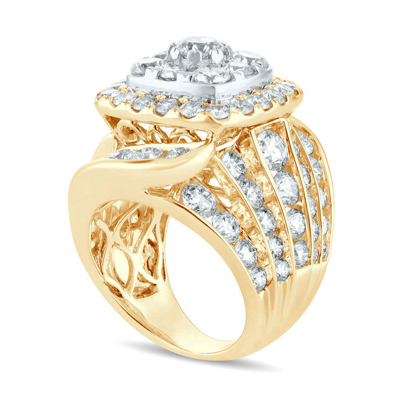 Experience absolute radiance with this exceptional diamond engagement ring - the one she's always dreamed of. Meticulously crafted in 14K gold, this captivating piece showcases a captivating cushion-shaped composite diamond array, with the largest sparkling at 5/8 ct. The impressive shank is crafted with multiple rows of channel-set diamonds, while a breathtaking outer ribbon of diamonds elegantly bypasses the stunning centerpiece. With a remarkable total weight of 10 cts. t.w. and a dazzlingly bright polished finish, this mesmerizing engagement ring is sure to catch her eye and win her heart.