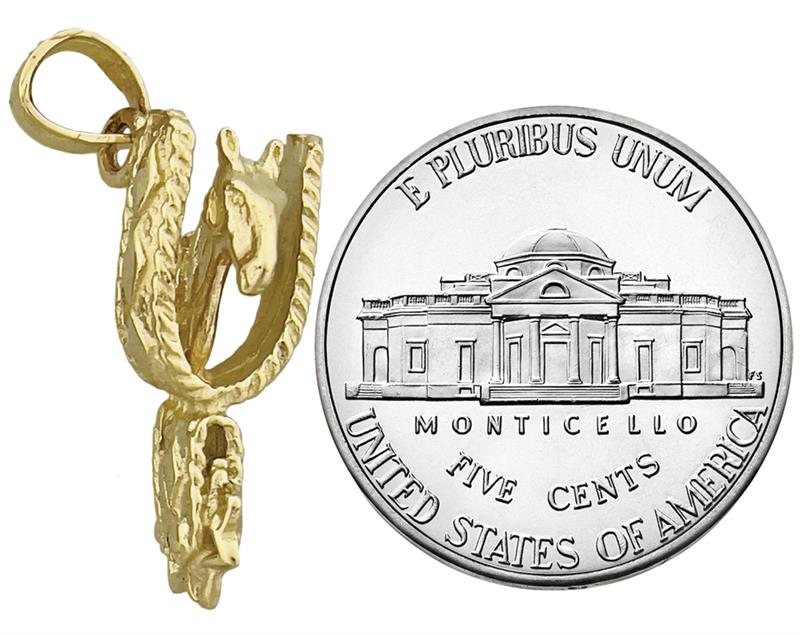 Allow this 14k gold three-dimensional cowboy spur charm to become the latest inclusion to your western jewelry troop with its beguiling charisma. The charm has been crafted with a glossy luster together with a 3-dimensional back aspect; it is 3/8 widthwise and 13/16 in length, achieving an estimated weight of 3.0 grams.