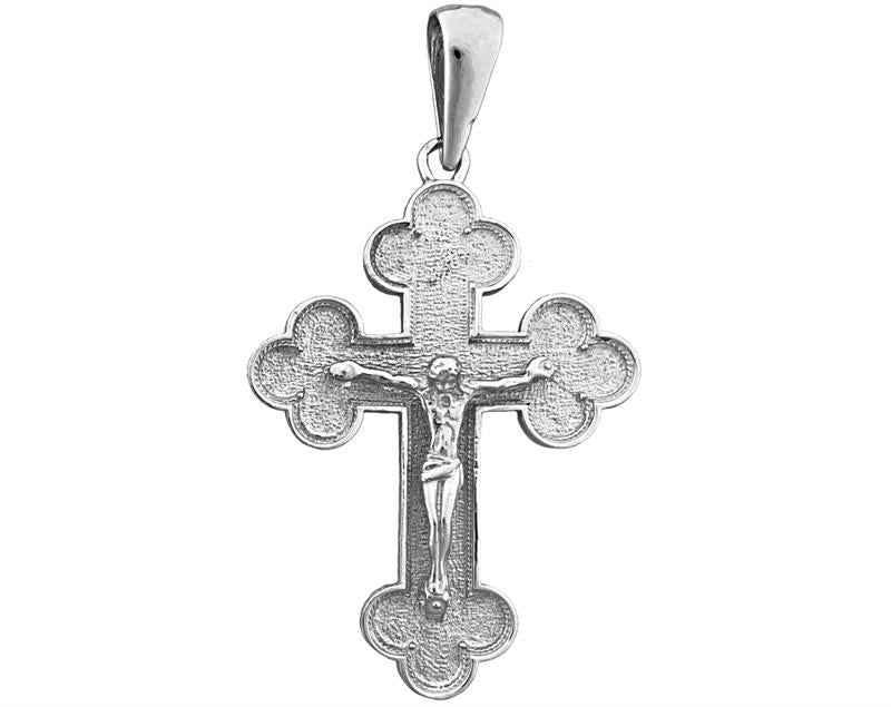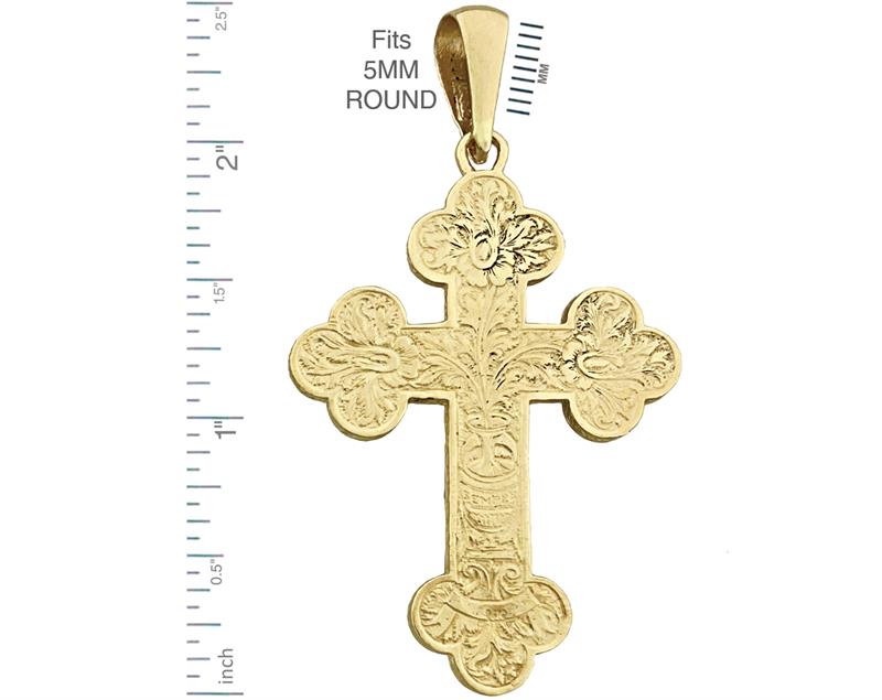 This fourteen-carat gold Eastern Orthodox crucifix pendant is a sacred emblem of Jesus Christ's crucifixion adhered to by Eastern Orthodox Christianity. Composed of a resilient and aesthetically pleasing 14-carat gold alloy, the pendant contains a highly precise portrait of Jesus upon the cross. As a token of devotion and piety, it is usually encircled around the wearer's neck via a necklace. The pendant is realized in a satin finish and boasts a flatbed corpus; it extends 1 5/16 width-wise and 1 3/4 longitudinally, estimating