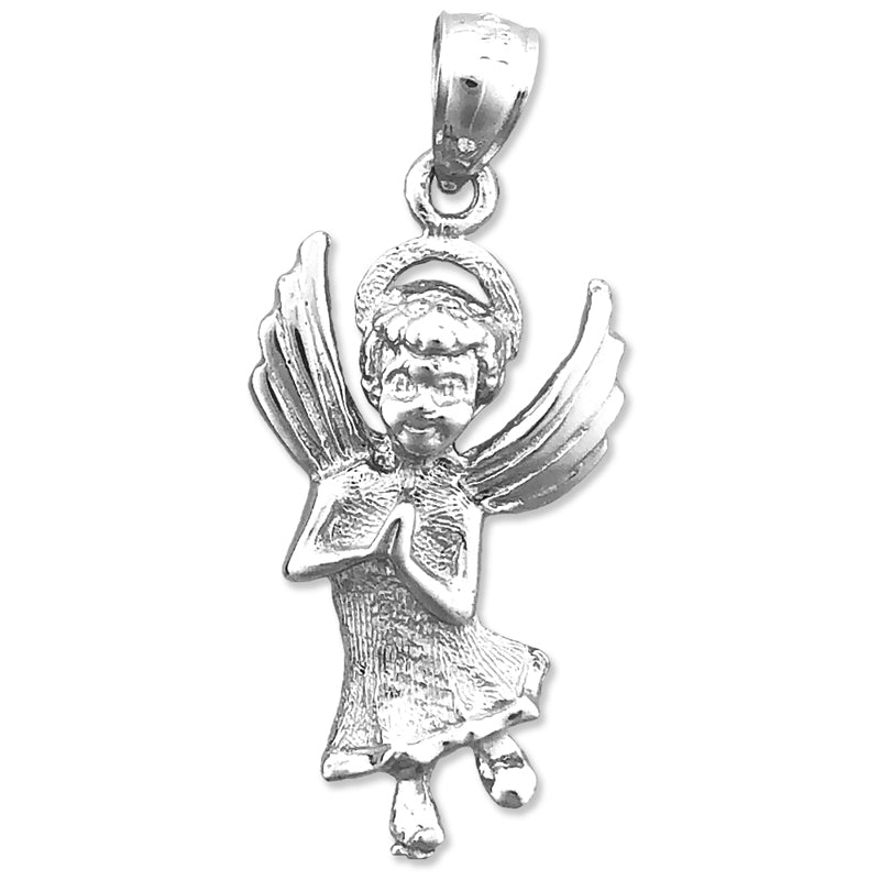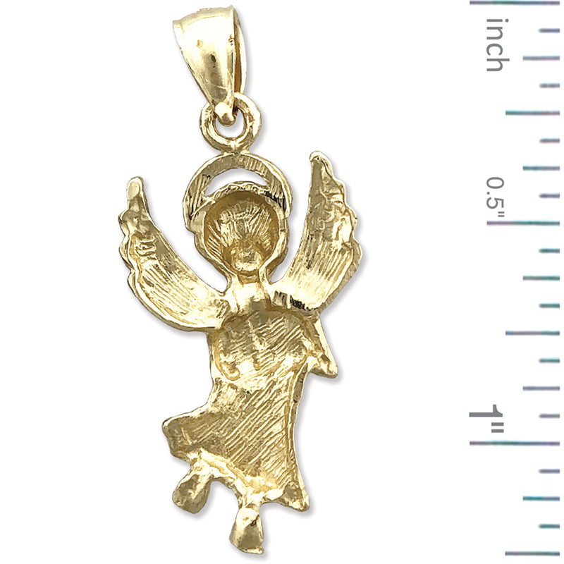 Drawing the attention of admirers with its captivating allure, this 14k gold haloed angel pendant is a stellar asset to add to a collection of spiritual jewelry. Refined with a lustrous finish for a luxe look, this piece is artfully designed with intricately carved details on its reverse. Its approximate dimensions are 9/16 inches wide and 7/8 inches high, and it weighs approximately 2.2 grams.