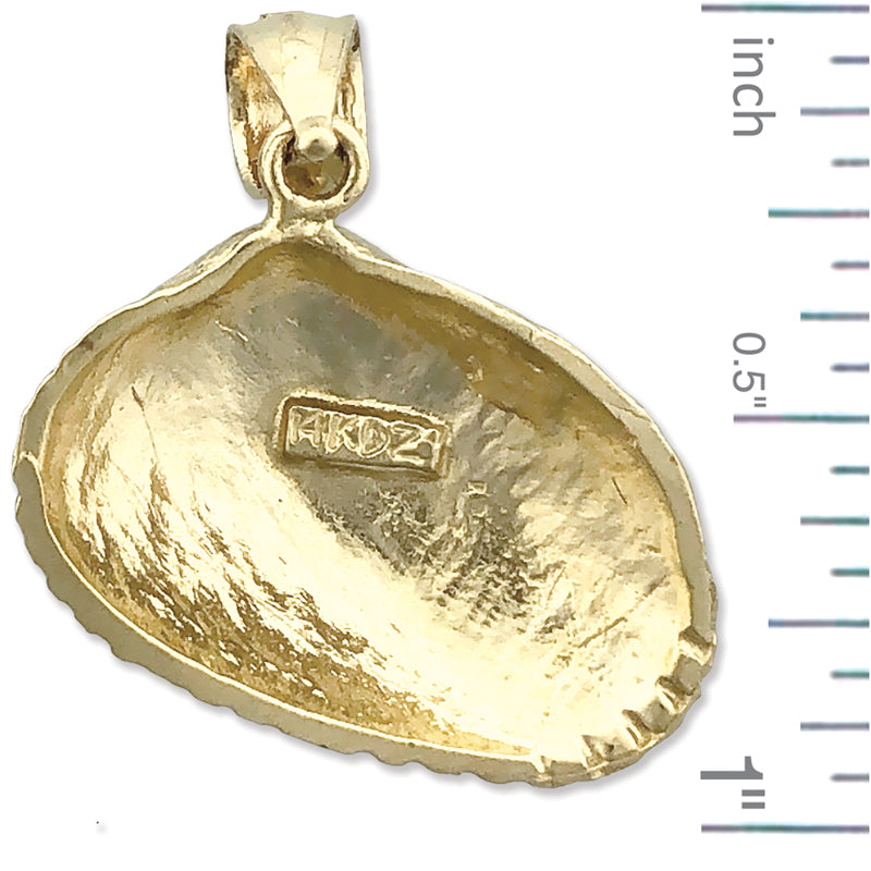 This delightful 14k gold seashell pendant, from our finely crafted selection of seashell jewelry, is a masterly representation of Nature's beauty. Meticulously molded with lustrous 14 karat gold, it serves as a stunning miniature of an immaculate mollusc clam. Captivating in its delicate details, its resplendent polish finish stands out all the more. In combination with the carved back design, it forms an exceptional necklace, perfect to don for any occasion. Measuring 7/8 wide by 5/8 high and weighing roughly 3.4 grams,