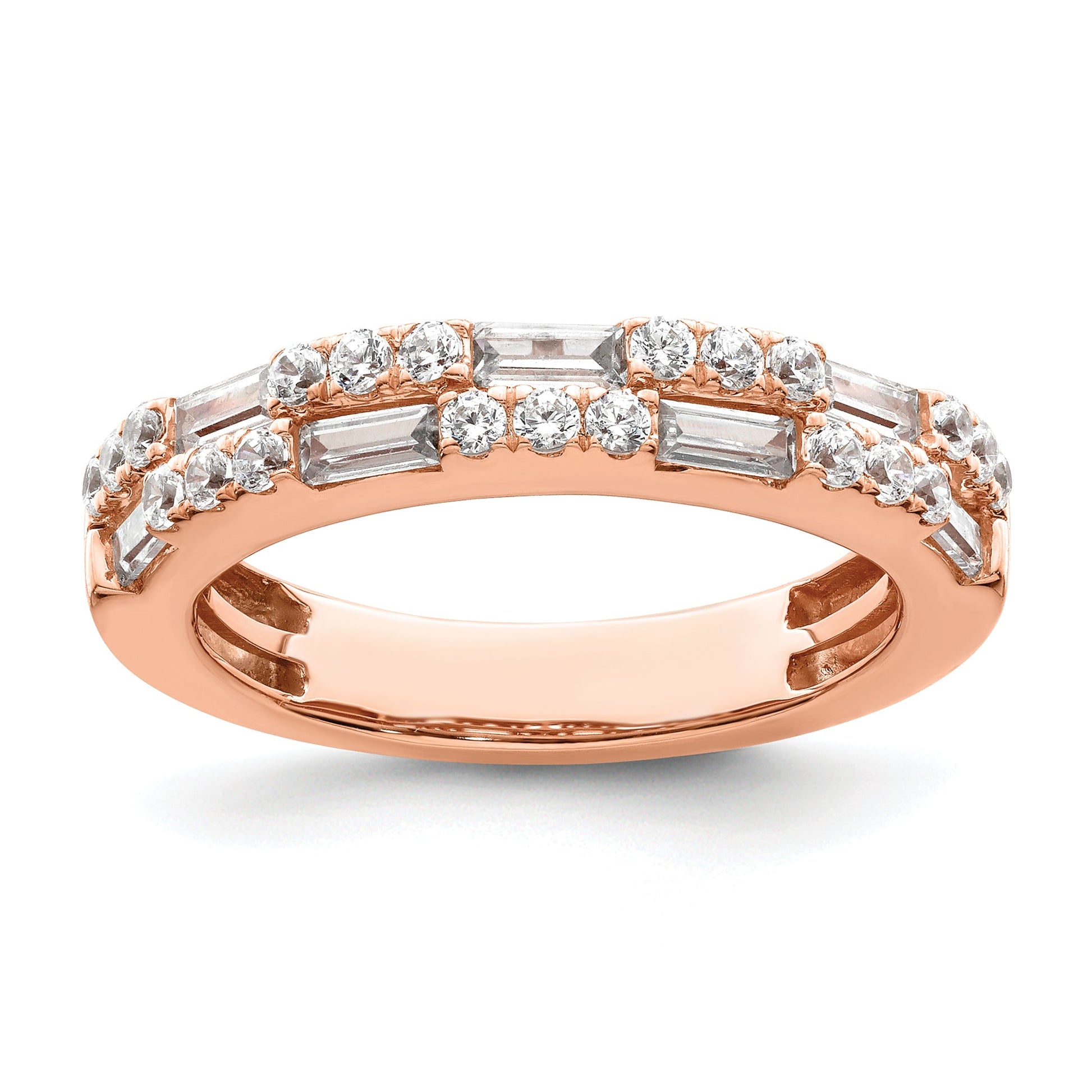 The 14K Rose Gold 1 Carat Round/Baguette Diamond Complete Wedding Band is a stunning choice for your special day. Crafted from solid 14K rose gold, this ring features a beautiful mix of 7 baguette and 21 round diamonds, all set securely in channel and prong settings. The diamonds, with a total weight of 0.085 and 0.02 carats respectively, shine with clarity and natural beauty. Perfect for women, this wedding band combines elegance with durability, thanks to its cast construction and versatile size range. For an eye-catching and meaningful symbol, look no further than the 14K Rose Gold 1 Carat Round/Baguette Diamond Complete Wedding Band.