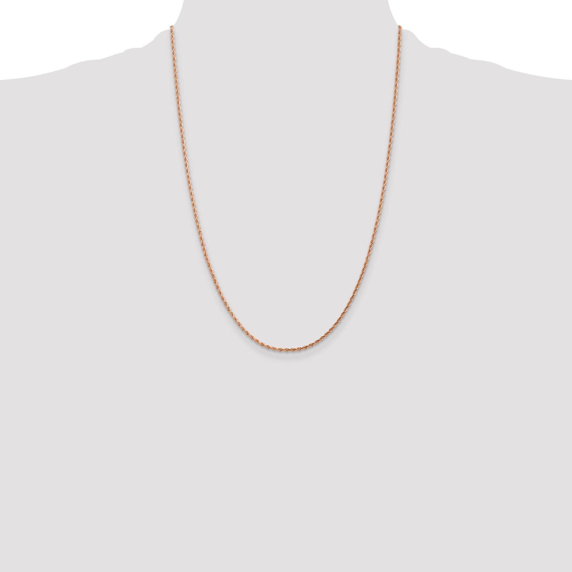 Introducing the 14K Rose Gold 24-inch Diamond-Cut Rope Chain with Lobster Clasp. This stunning piece is handcrafted from polished 14K rose gold, ensuring it captures the eye of anyone who sees it. Spanning 24 inches in length and boasting a 1.75mm width, its diamond-cut texture adds a touch of sophistication. The durable lobster clasp ensures a secure fit. Perfect for women's jewelry, the 14K Rose Gold 24-inch Diamond-Cut Rope Chain adds elegance to any outfit.