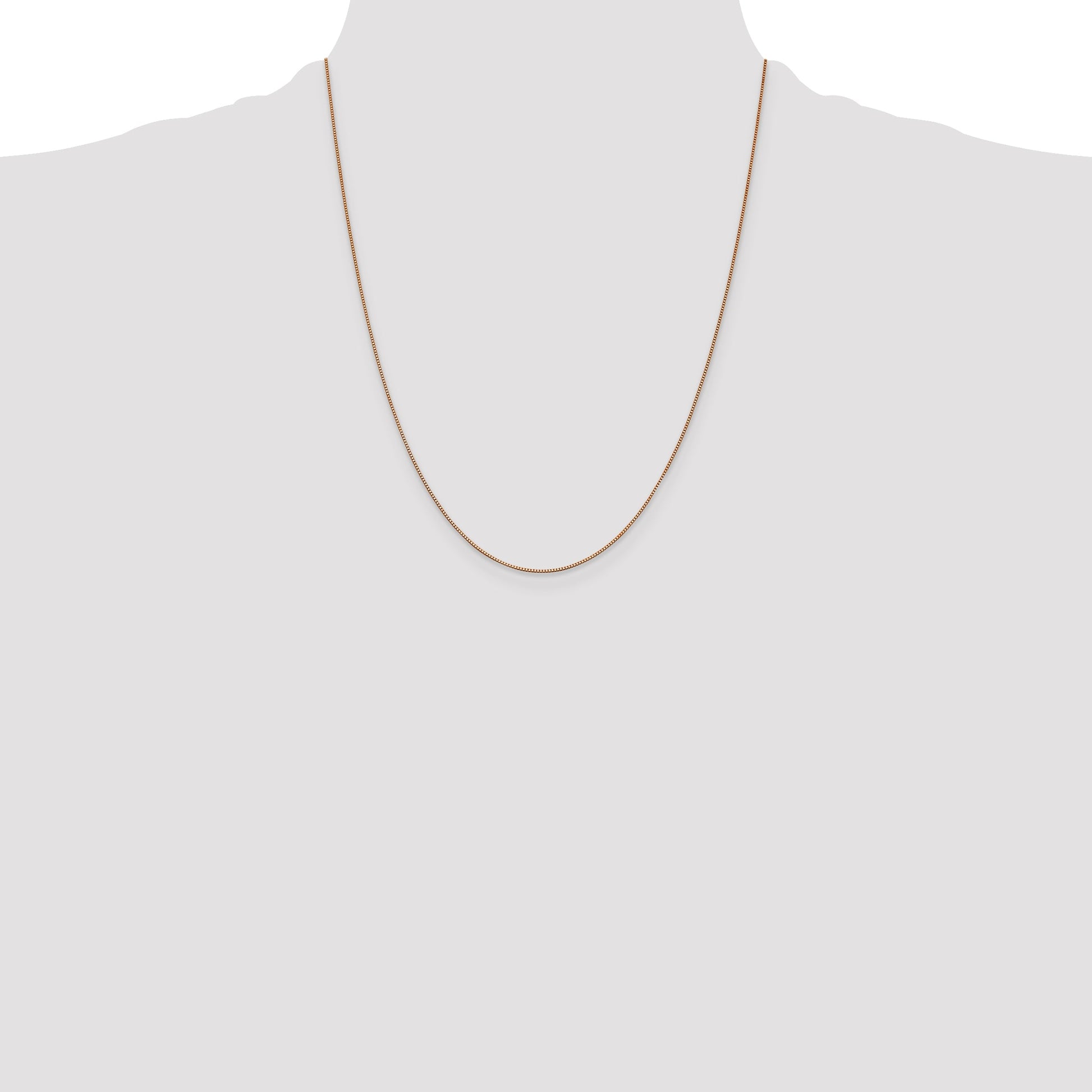 Introducing the 14K Rose Gold 22 Inch 0.7mm Box Link Chain with a lobster clasp. This exquisite necklace showcases the beauty of rose gold in a slender and refined design. Crafted with high-quality 14K gold, the polished finish reflects light with elegance, making it a perfect accessory for any occasion. The sturdy box link design provides a timeless appeal, complemented by its reliable lobster clasp for secure wear. With a length of 22 inches, this chain sits gracefully, offering versatility for layering or standalone wear. The 14K Rose Gold Chain delivers sophistication and durable style, elevating any jewelry collection.