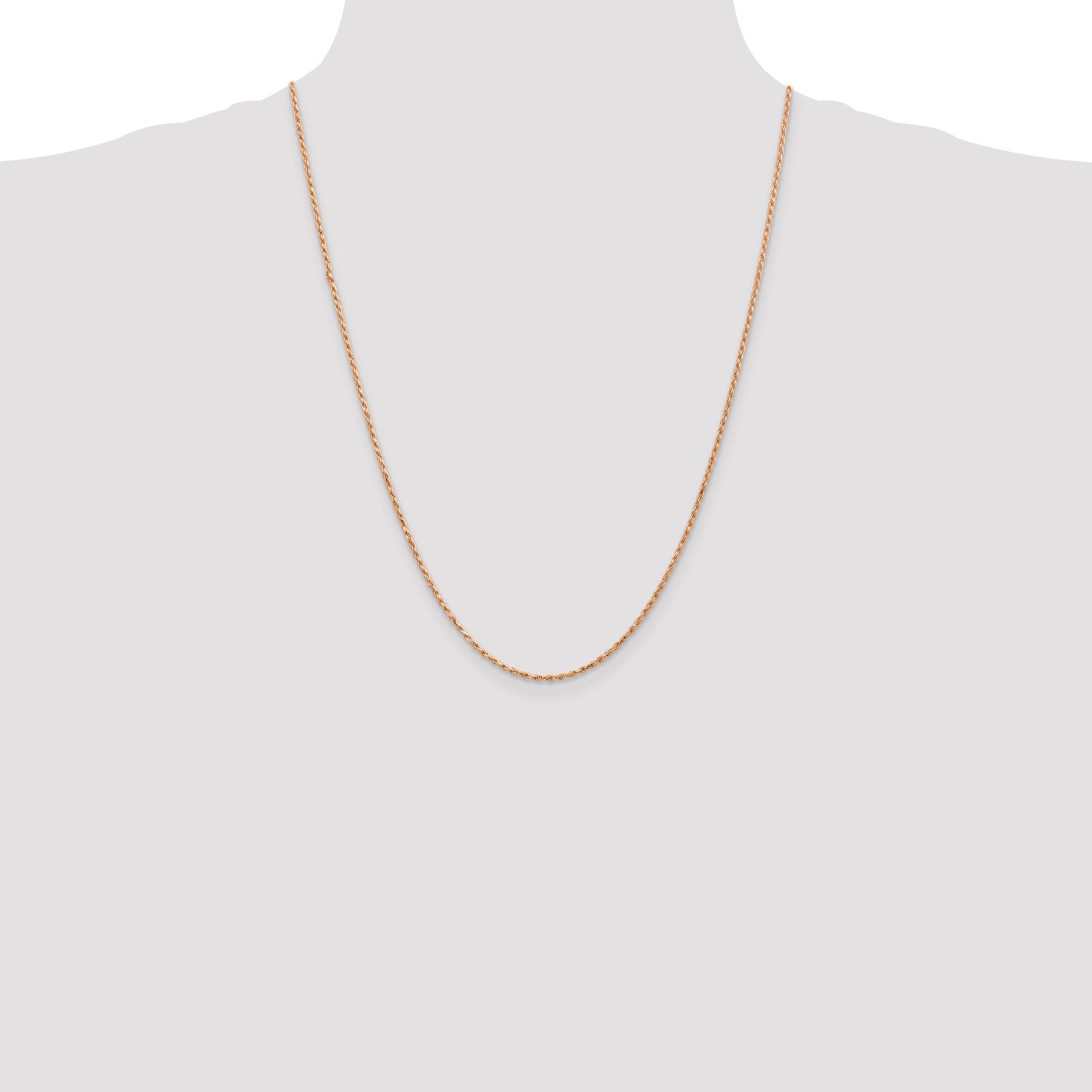 Elevate your style with this stunning 14K Rose Gold 24-Inch Rope Chain Necklace. The diamond-cut design catches the light beautifully, adding a touch of sparkle to any outfit. Made of high-purity rose gold, this delicately polished chain speaks elegance and grace, perfect for any occasion. Measuring a versatile 24 inches and 1.8mm wide, it fits effortlessly with your favorite pendants. The sturdy lobster clasp ensures a secure fit, while the solid and durable construction promises longevity. Let this intricate piece make a refined statement in your jewelry collection today.