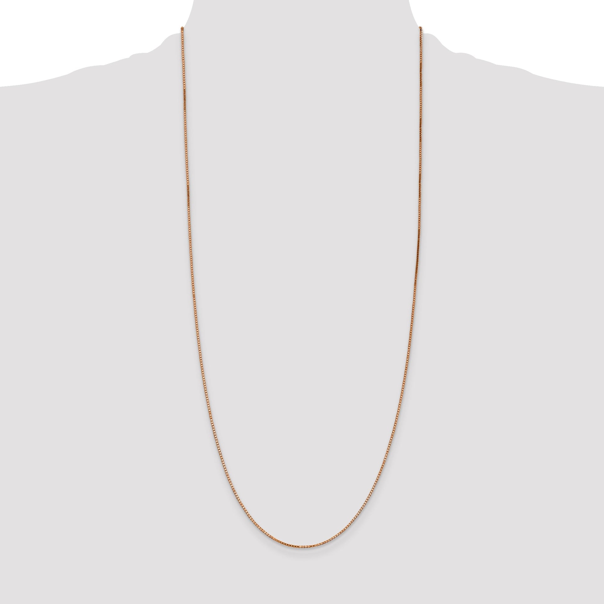 The 14K Rose Gold 30 Inch 1.10mm Box Link Chain is a timeless piece perfect for every jewelry collection. Made from solid 14-karat rose gold, this necklace has a polished finish that exudes elegance. With a slender width of 1.10mm, it offers a delicate but strong look. The 30-inch chain length provides versatility, making it ideal for layering or wearing solo. The lobster clasp ensures a secure fit. The chain's box-link style brings a classic touch, crafted through a meticulous extrusion and die-struck process. Elevate your style with this stunning 14K Rose Gold Chain.