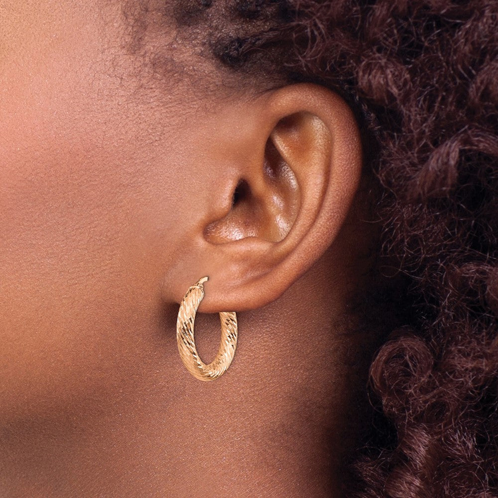 These 14K Rose Gold 4mm Polished Diamond-Cut Round Hoop Earrings bring elegance to any outfit. Crafted from the finest 14K gold, they shine with a polished finish that catches the eye. The diamond-cut texture adds an extra touch of brilliance, making these hoops stand out in your collection. With a thickness of 4mm and a length of 23.4mm, they offer a perfect blend of size and style. The secure wire and clutch closure keeps them snug, perfect for all-day wear. Elevate your look with these stunning 14K Rose Gold Diamond-Cut Hoop Earrings.