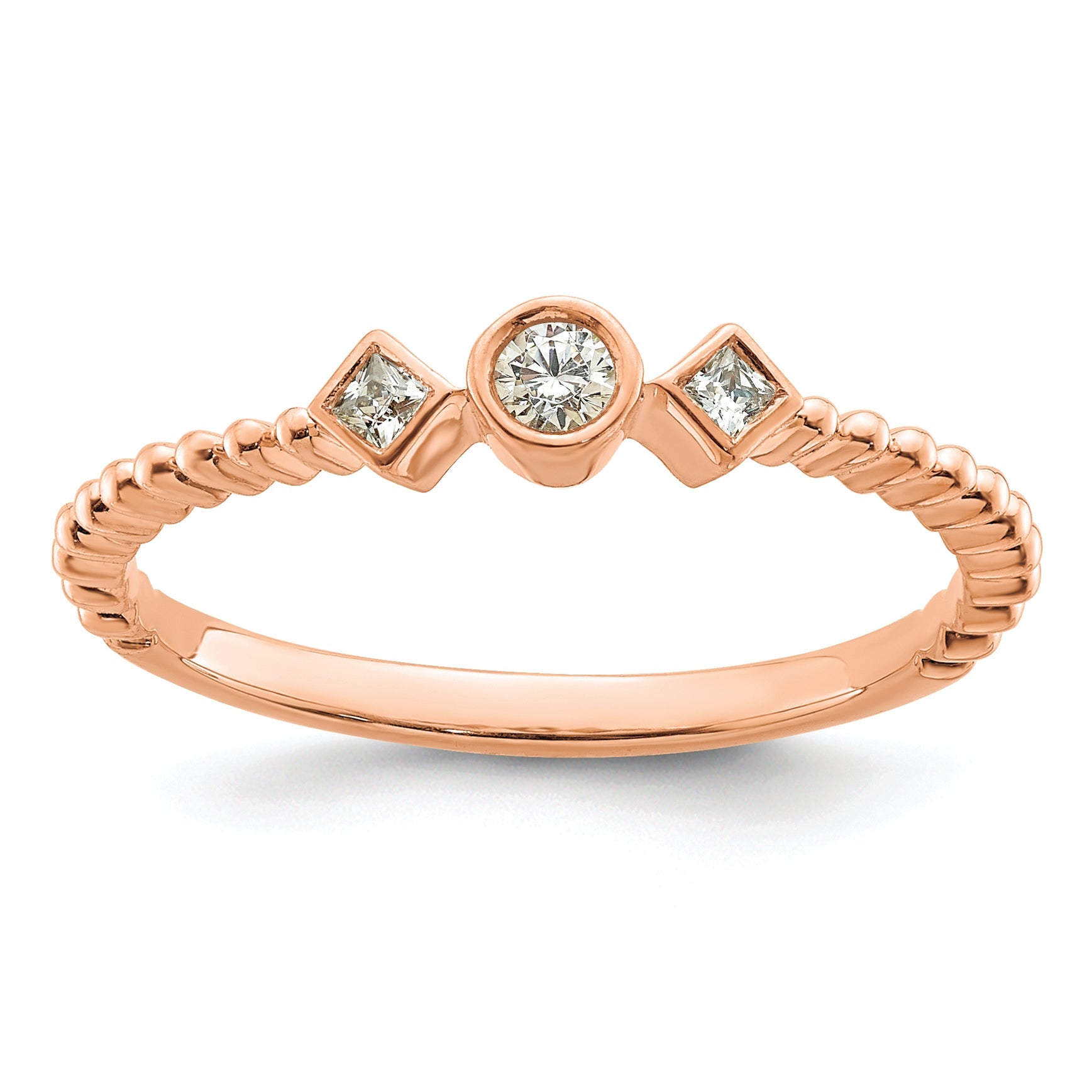 The 14K Rose Gold Scalloped Band Petite 3-Stone 1/15 Carat Round Diamond Promise Ring truly shines with its delicate design. Crafted from polished rose gold, this ring features a scalloped band that tapers beautifully from 1.1 to 1.4 mm, giving it a sleek look. It boasts three bezel-set diamonds, with one round and two princess-cut stones, totaling 1/15 carats. These natural stones sit securely, highlighting their clarity and sparkle. Ideal for all occasions, the ring is sized from 6 to 8 and is fully complete with all stones included. The 14K Rose Gold Scalloped Band Petite 3-Stone 1/15 Carat Round Diamond Promise Ring is a perfect choice to symbolize love and commitment.