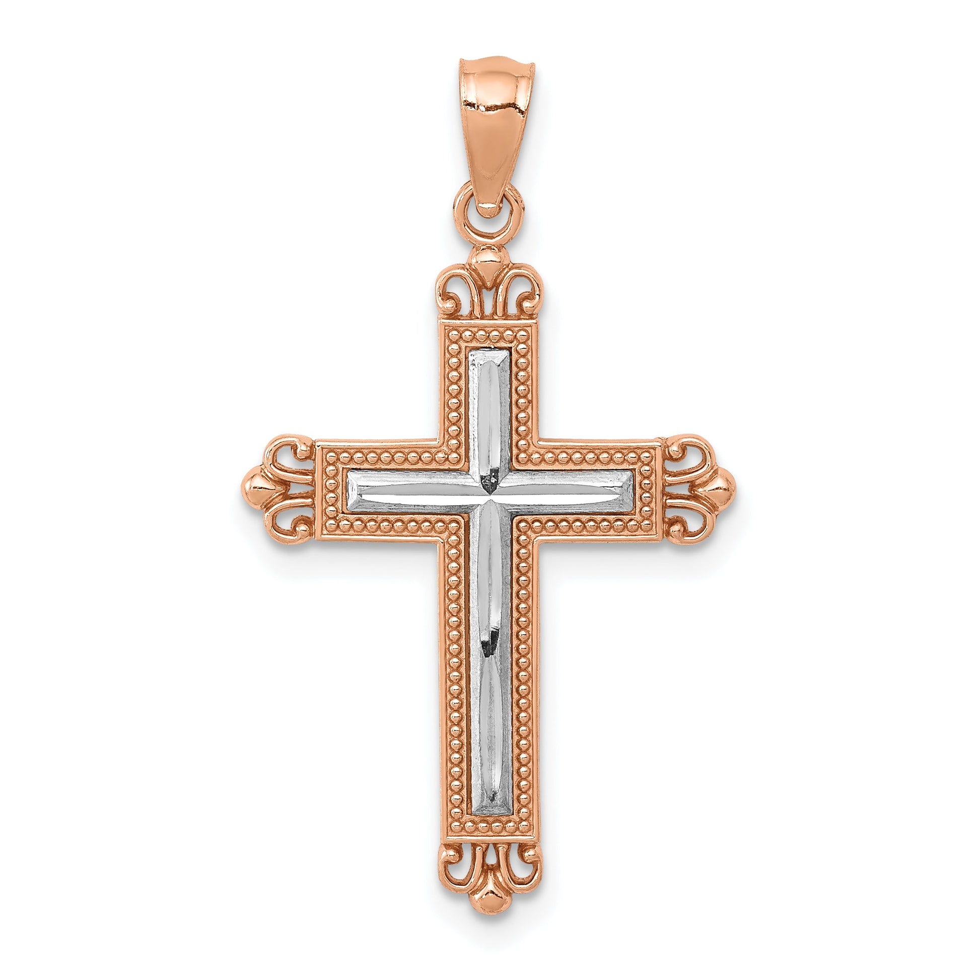 The 14K Rose Gold with Rhodium Diamond-Cut Cross Pendant exudes elegance and grace. Crafted from 14K rose gold and enhanced with rhodium plating, this pendant radiates a brilliant shine. The diamond-cut texture adds a sparkling finish, making it a standout piece. Measuring 27 mm in length and 18 mm in width, it hangs beautifully around the neck, complemented by a sturdy 3 mm bail. Perfect for any occasion, the 14K Rose Gold with Rhodium Diamond-Cut Cross Pendant blends timeless beauty with modern style, adding a touch of sophistication to your jewelry collection.