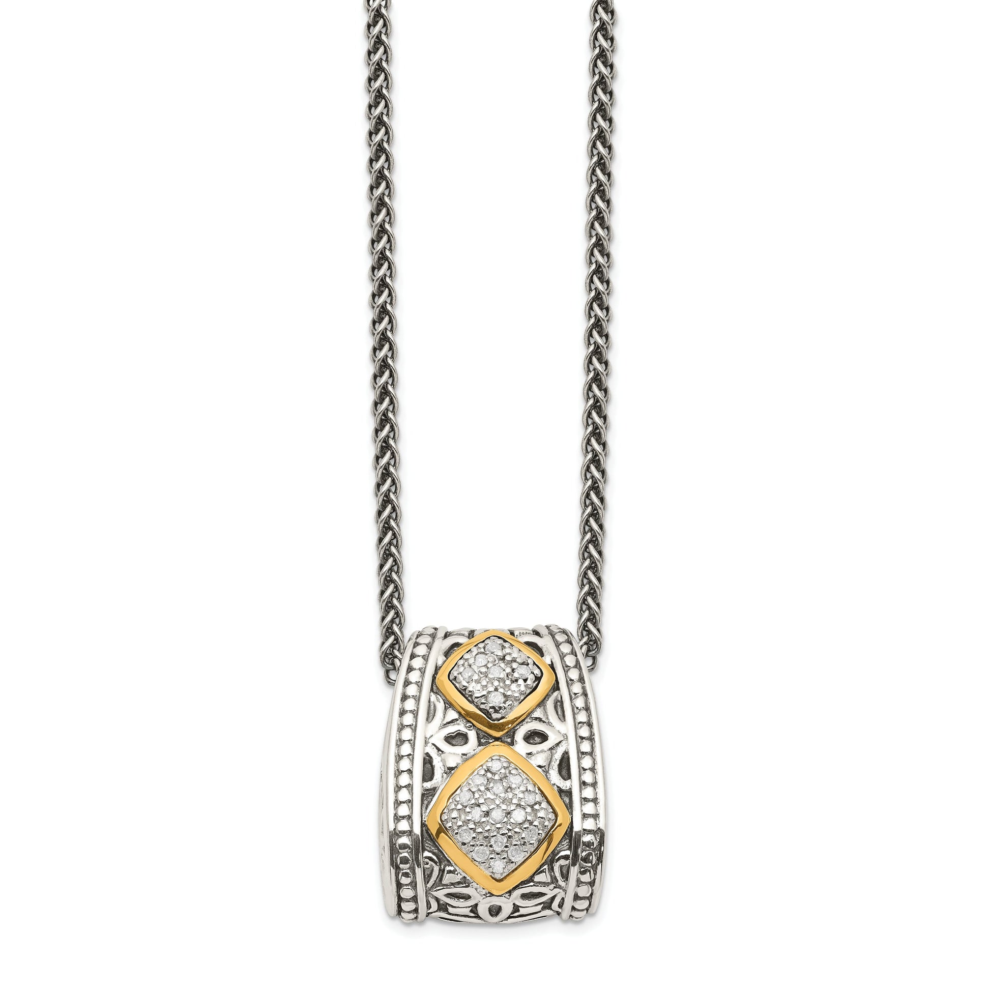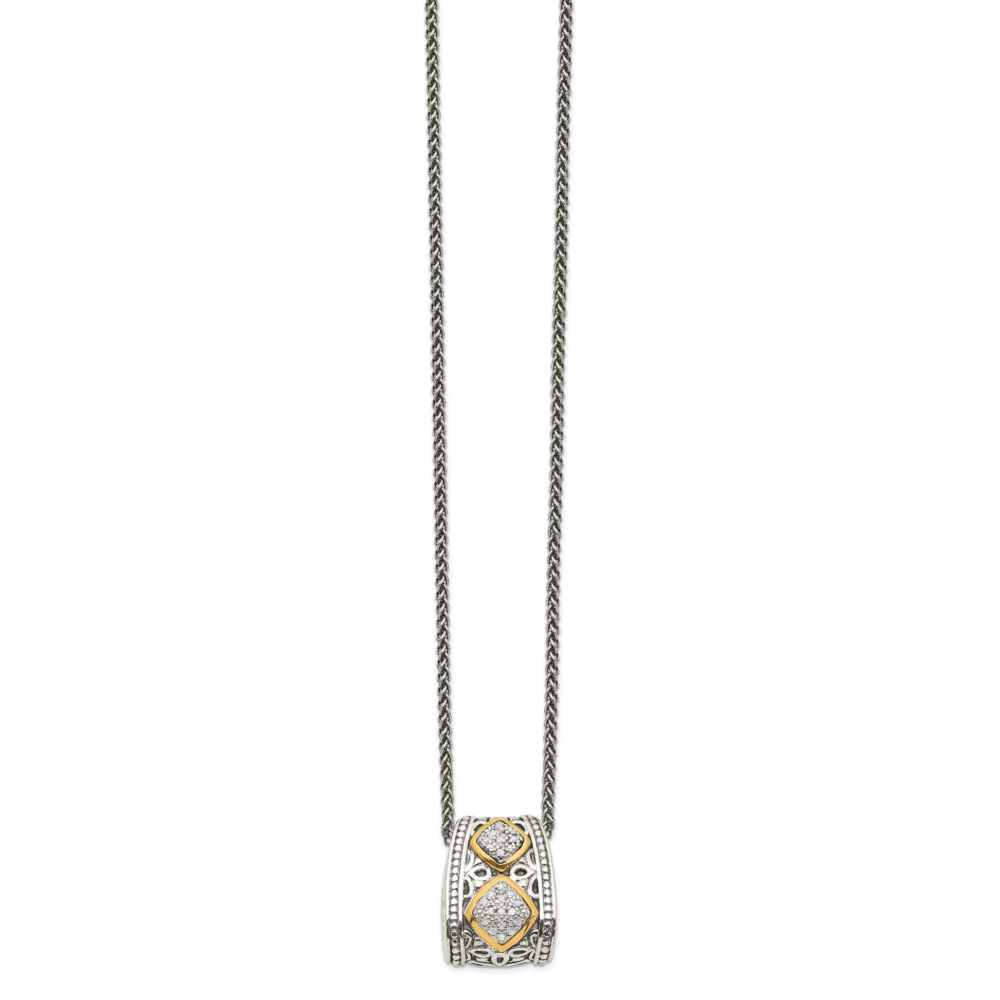 The 14K/Silver Two-Tone Shey Couture Sterling Silver Antiqued Necklace is a standout piece for women. It features a polished and antiqued silver finish, complemented by 14K yellow gold accents. The necklace is 18 inches long with a sleek spiga (wheat) chain that measures 2mm wide. A fancy pendant, 20mm by 14mm, adds charm with 20 natural round diamonds totaling 0.005 carats. The lobster clasp ensures a secure fit, making this necklace both stylish and sturdy. Shey Couture crafted the necklace with care, blending elegance with a touch of bold design.