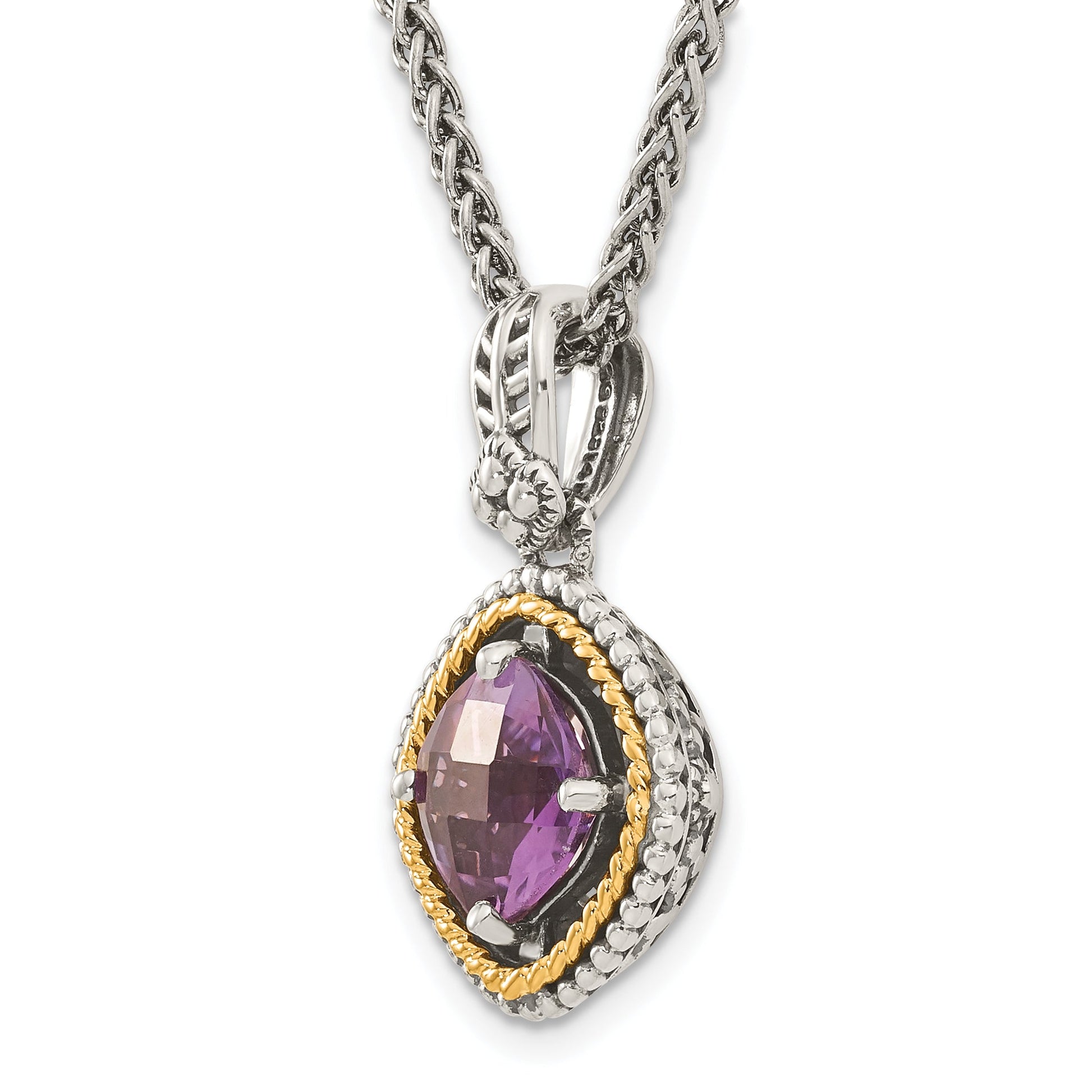 Discover the stunning 14K/Silver Two-Tone Shey Couture Sterling Silver with 14K Accent 18 Inch Antiqued Cushion Amethyst Necklace. This piece blends rich silver with warm gold accents, creating a bold yet elegant look. The 8mm cushion amethyst, crafted naturally and heated for strength, shimmers in purple hues. The necklace features a delicate 2mm Spiga chain in white and yellow tones, measuring 18 inches. A lobster clasp ensures a secure fit. Perfect for women who want a unique, eye-catching jewelry piece, the 14K/Silver Two-Tone Shey Couture Sterling Silver with 14K Accent 18 Inch Antiqued Cushion Amethyst Necklace blends quality with style for any occasion.
