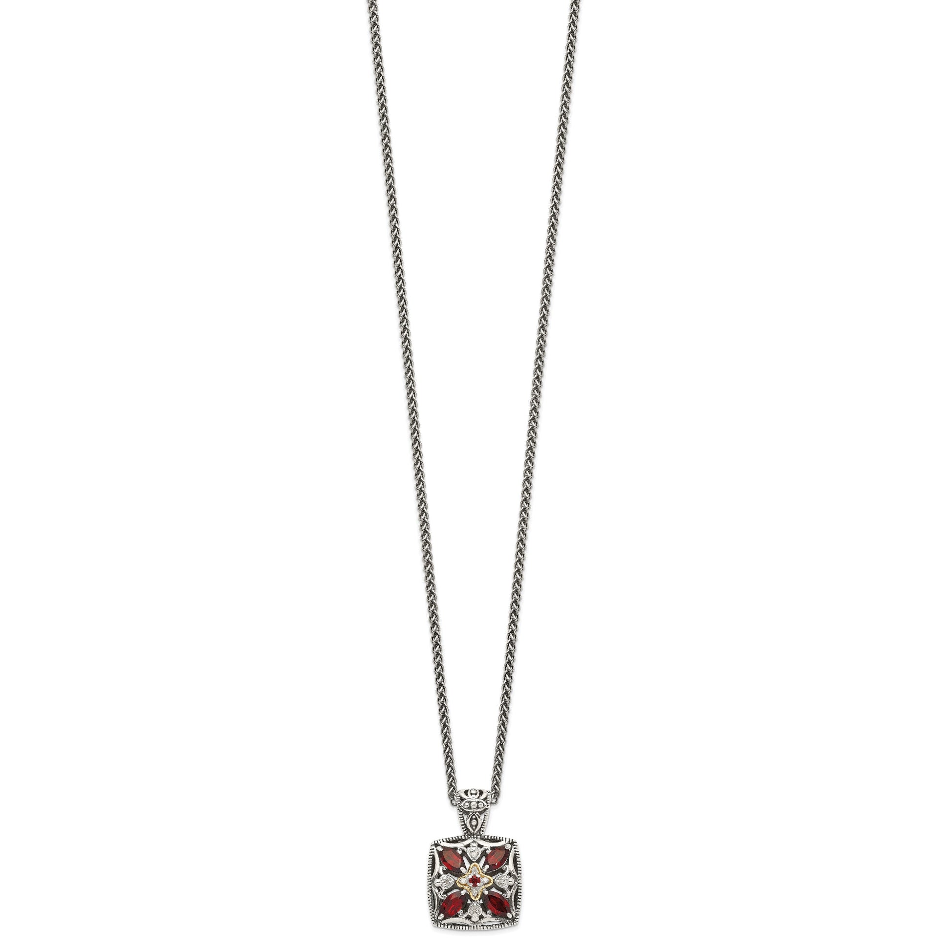 Discover the stunning 14K Silver and Shey Couture Sterling Silver Necklace, a bold piece that combines elegance and edge. This necklace features a beautiful mix of genuine garnets and sparkling diamonds, all set in a rich two-tone finish with yellow 14K gold accents. The antiqued sterling silver gives it a vintage feel, while the 18-inch chain ensures it sits just right. The eye-catching pendant, measuring 25mm by 16mm, showcases marquise and round stones, highlighting fine craftsmanship. Perfect for adding a touch of class to any outfit, the 14K Silver Shey Couture Sterling Silver Necklace is a jewelry piece that stands out.