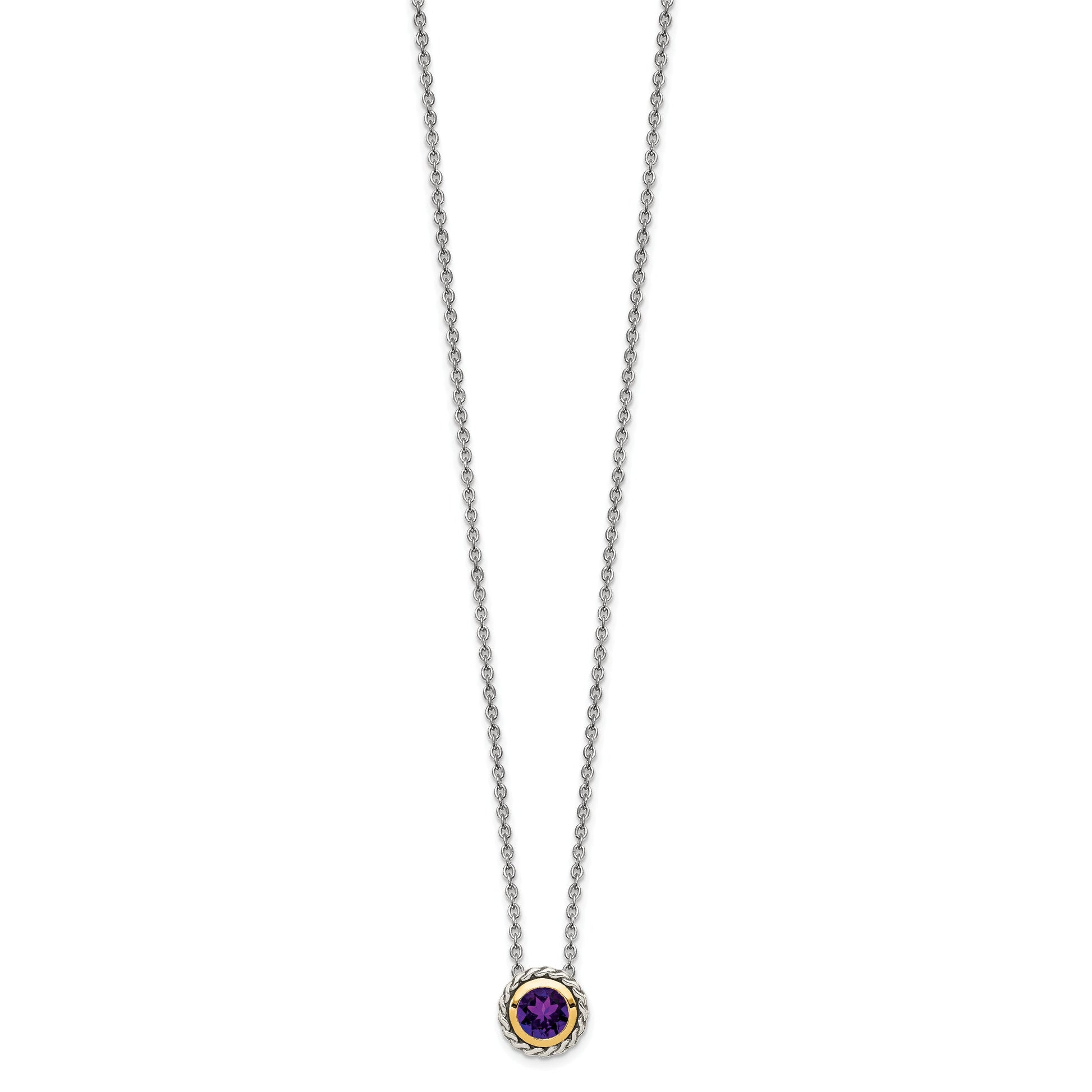 Discover the stunning 14K/Silver Two-Tone Shey Couture Sterling Silver With 14K Accent 18 Inch Antiqued Round Bezel Amethyst Necklace. Crafted from high-quality sterling silver, this necklace features a deep purple amethyst set within a round bezel, accented with gleaming 14K gold touches. The 18-inch cable chain offers a comfortable fit, while the textured finish adds a vintage charm. Perfect for women who love bold, elegant jewelry, the necklace combines natural gemstone beauty with durable design. With its rich colors and detailed craftsmanship, the 14K/Silver Shey Couture necklace makes a versatile, eye-catching piece for any outfit.