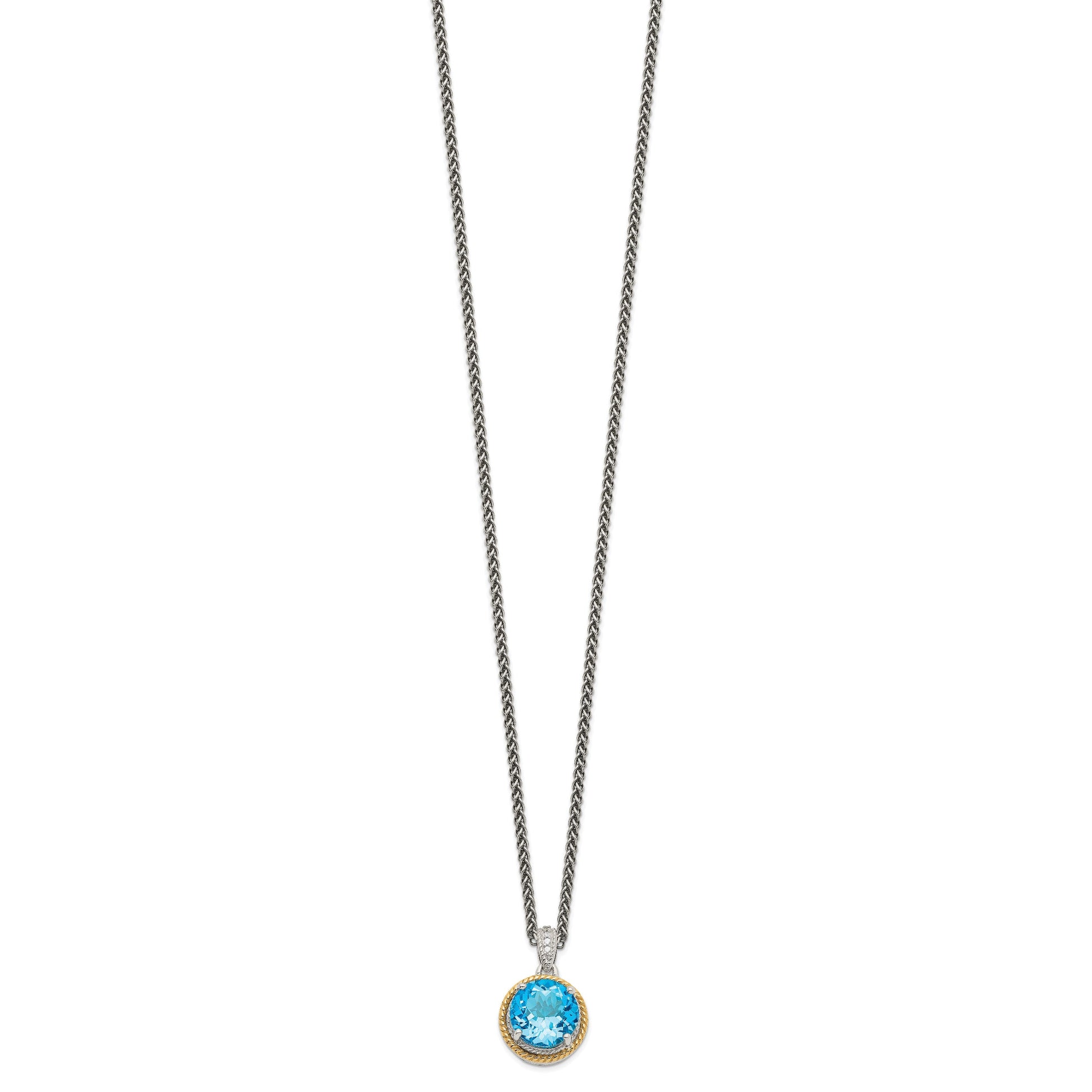 The 14K/Silver Two-Tone Shey Couture Sterling Silver With 14K Accent 18 Inch Antiqued Round Blue Topaz Necklace is a real eye-catcher. Its rich mix of sterling silver and yellow 14K gold accents adds a warm glow. The necklace features a stunning Swiss Blue Topaz stone, set with prongs for added security. Measuring 18 inches long, the chain has a sleek 2mm width, perfect for everyday wear. The antiqued finish gives it a vintage charm, while the natural blue topaz bursts with color. This piece combines style with quality—Shey Couture’s signature touch—making it a must-have for jewelry lovers.