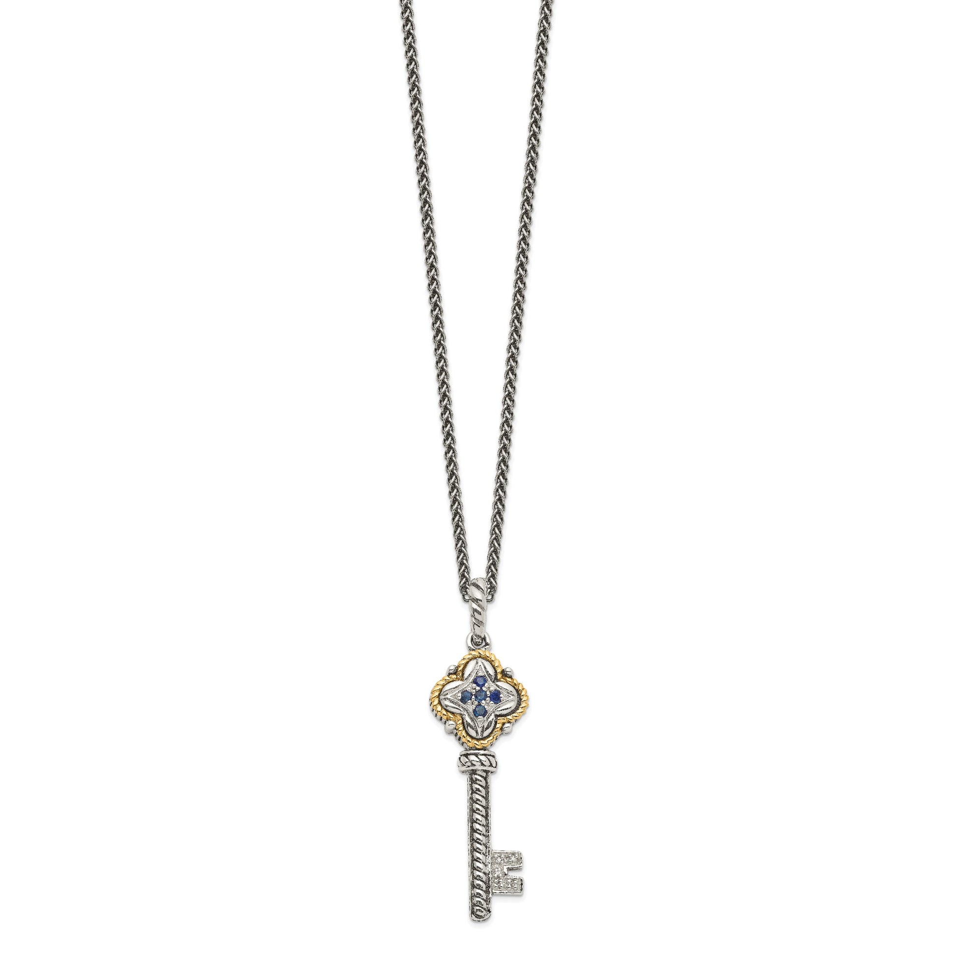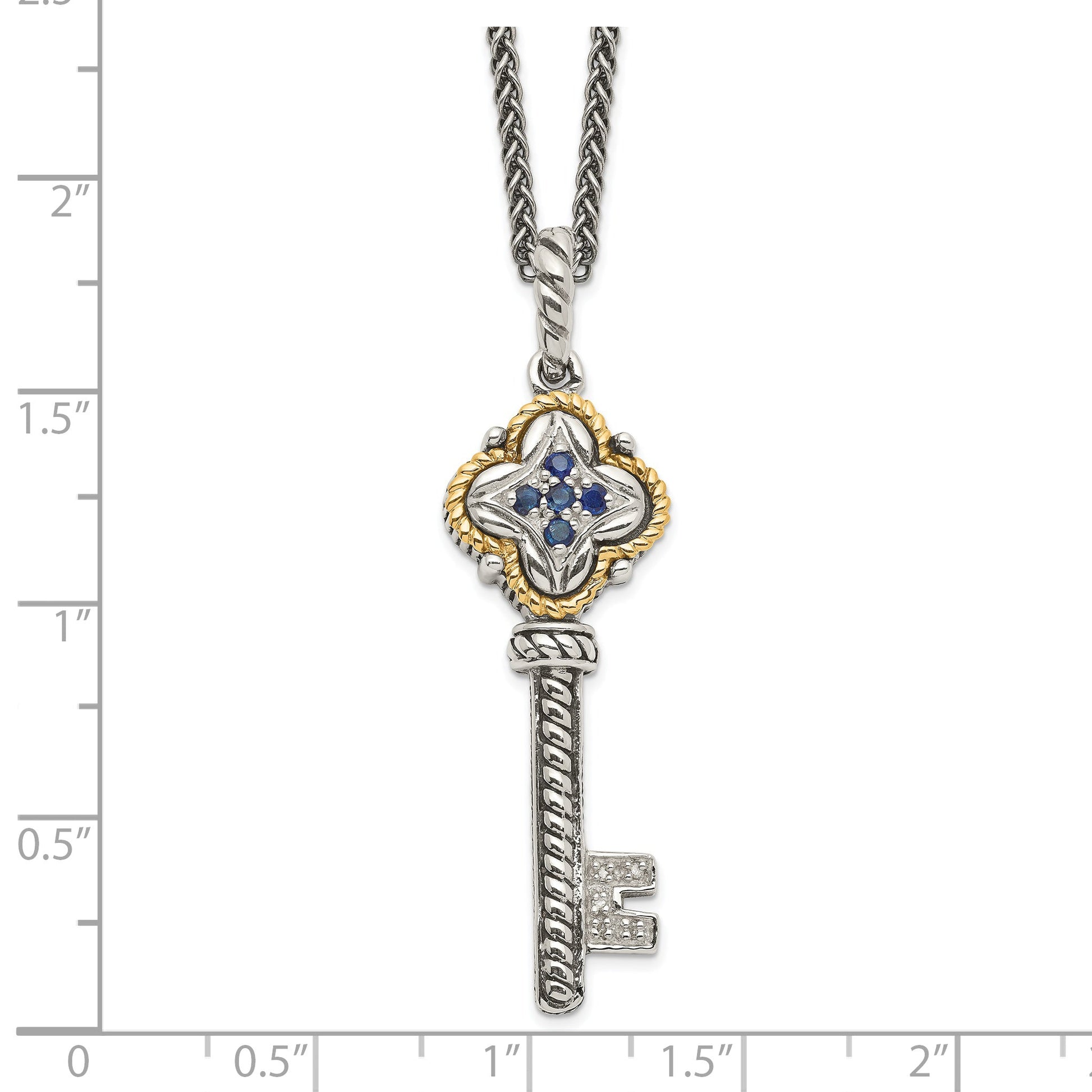 Discover the stunning 14K/Silver Two-Tone Shey Couture Sterling Silver with 14K Accent 18 Inch Antiqued Sapphire and Diamond Key Necklace. This beautiful piece features a 925 sterling silver base with an antiqued finish, giving it a vintage look. Decorated with five sparkling sapphires and five tiny diamonds, it adds a touch of elegance. The necklace measures 18 inches, with a 2 mm wheat-style chain and a solid lobster clasp for easy wear. The key-shaped pendant, filled with vibrant yellow 14K gold accents, makes a statement. Shey Couture crafted this necklace to blend timeless charm with modern style.