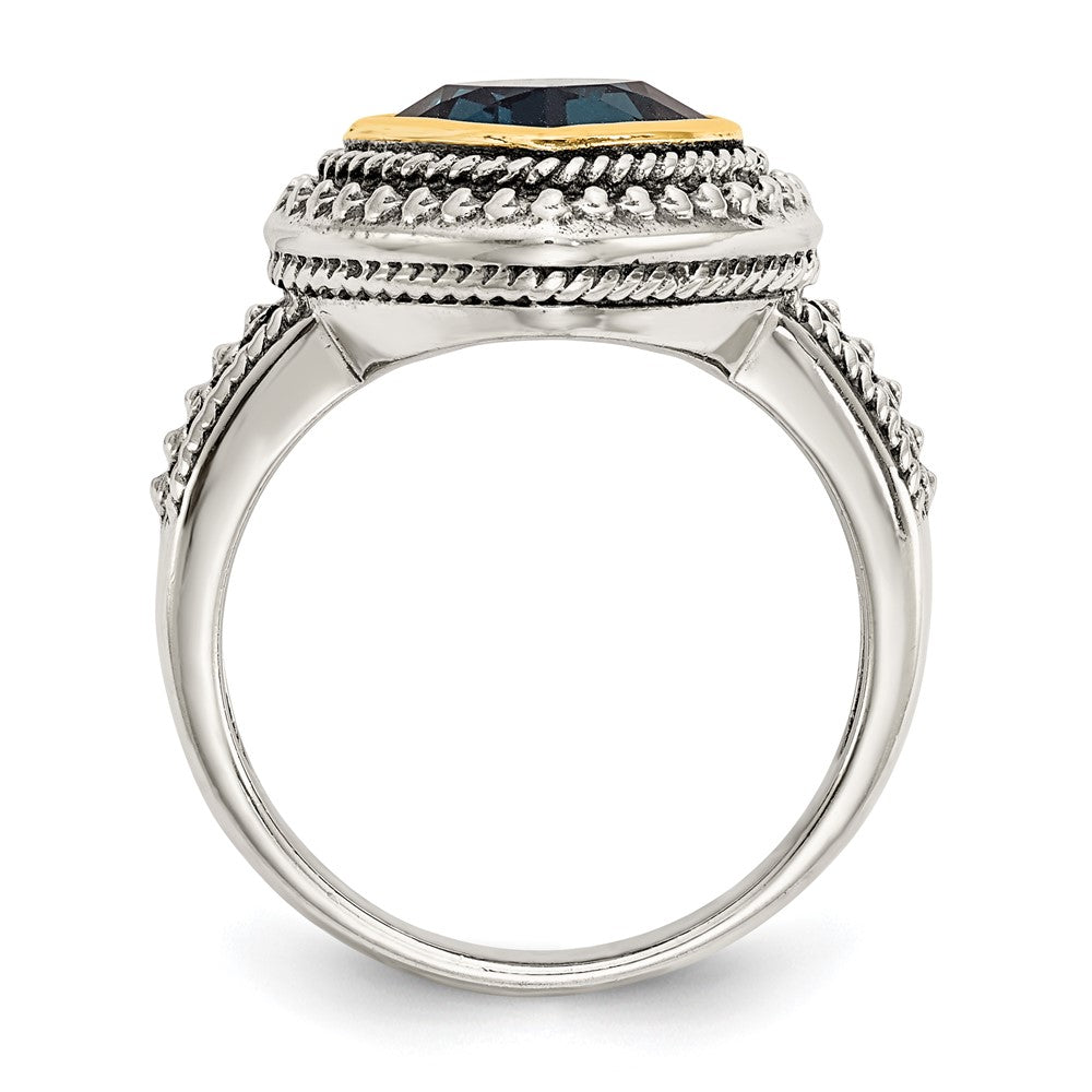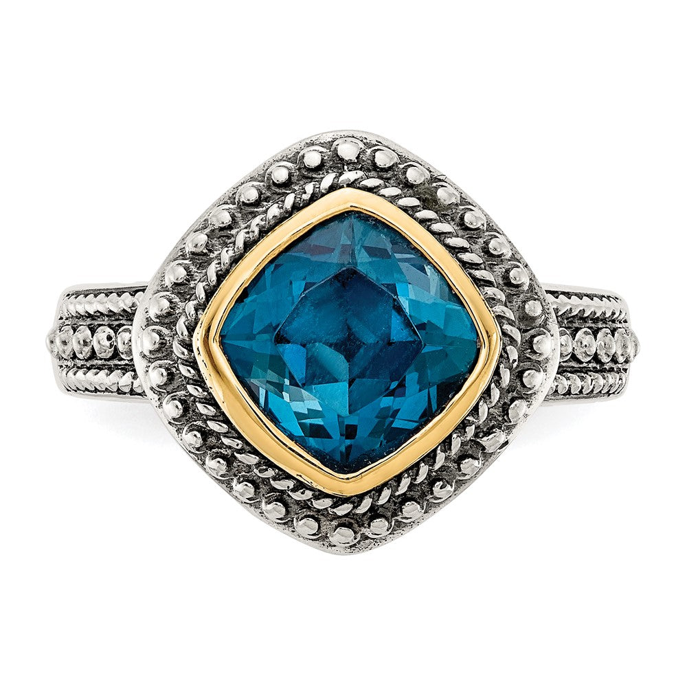 Introducing the 14K/Silver Two-Tone Shey Couture Sterling Silver With 14K Accent Antiqued London Blue Topaz Ring. Crafted from high-quality sterling silver with a rich antiqued finish, this ring showcases a stunning 8mm cushion-shaped London Blue Topaz, valued at 2.7 carats. It features a sleek bezel setting with bright yellow 14K gold accents, adding warmth and style. Perfect for December birthdays, this solid, cast ring blends elegance with a modern edge. The unique two-tone design makes it a versatile piece for any jewelry collection, celebrating your special month with timeless shine.