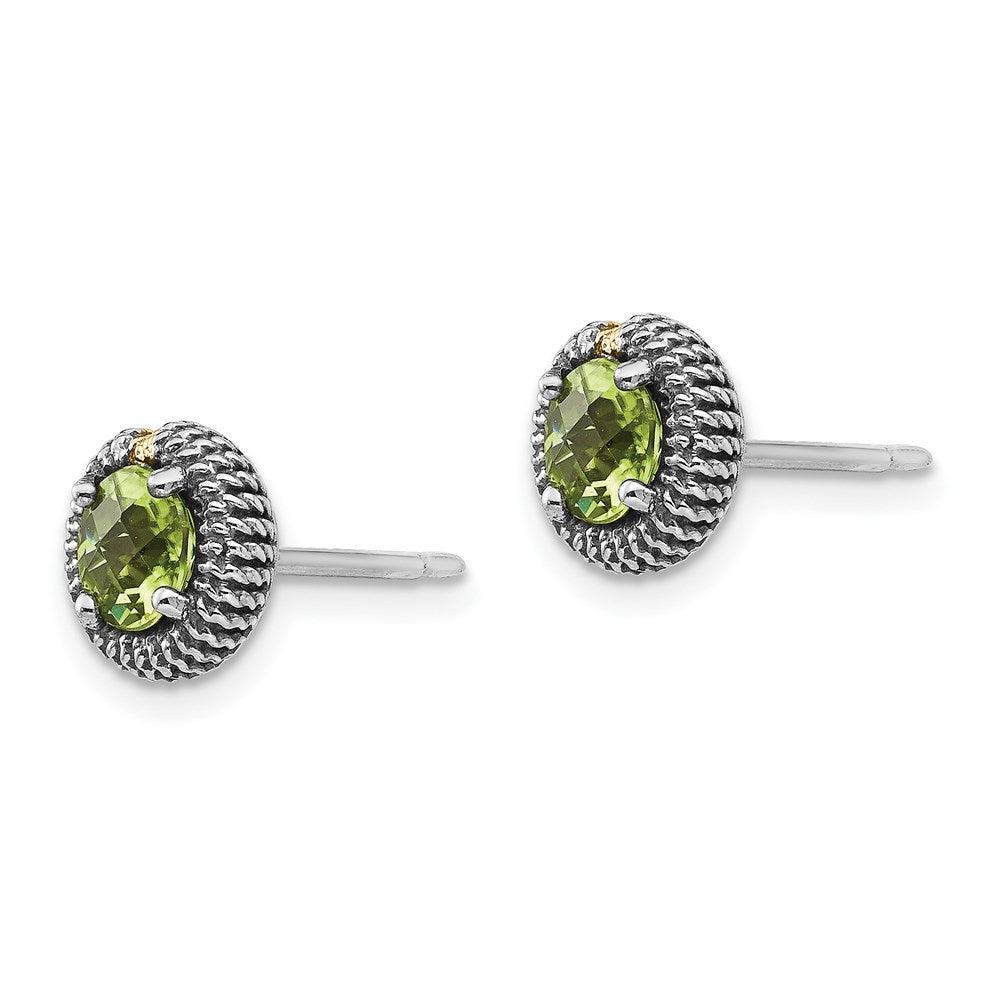 Discover the stunning 14K/Silver Two-Tone Shey Couture Sterling Silver with 14K Accent Antiqued Round Peridot Post Earrings. These elegant studs feature vibrant green Peridot stones set in a classic round shape, with each stone weighing 0.45 ct and prong-set for durability. The jewelry combines solid sterling silver with warm yellow 14K accents, offering a perfect blend of shine and vintage charm. Measuring 13 mm in length and 7 mm wide, these earrings are crafted with care and designed for daily wear. Shey Couture makes jewelry that stands out, and the Peridot birthstone adds a special touch.