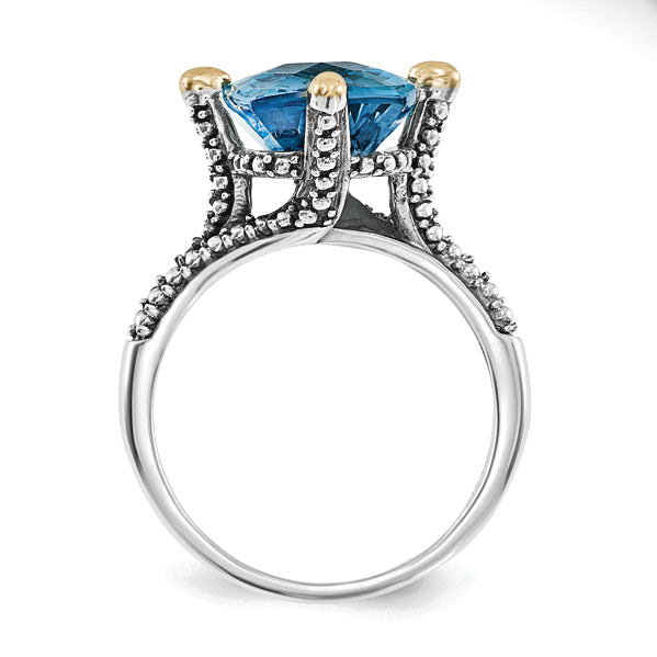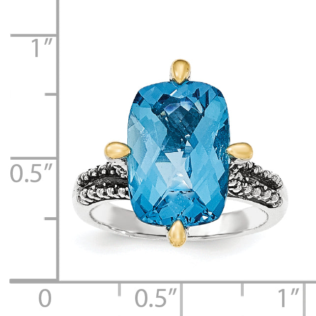 The 14K/Silver Two-Tone Sterling Silver with 14K Light Swiss Blue Topaz Ring shines as a perfect piece for any occasion. Crafted with a blend of silver and gold, it offers a stylish two-tone look. The ring features a stunning 14x10 mm cushion-shaped Swiss Blue Topaz with a checkerboard cut, set securely with prongs. Weighing 7 carats, this December birthstone adds a pop of vibrant blue. The gold accents give it a warm glow and a touch of elegance. The ring’s design ensures it stands out and makes a bold statement. Perfect for those who want jewelry with both sparkle and meaning.