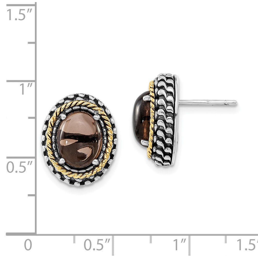 Introducing the 14K/Silver Two-Tone Sterling Silver with 14K Polished and Antiqued Oval Smoky Quartz Post Earrings. These earrings feature stunning oval-shaped smoky quartz stones, each measuring 10 by 8 mm, prong-set to catch the light and add sparkle. The mix of polished silver and warm yellow 14K gold accents gives a chic, two-tone look that works with any style. The 16.2 mm length provides a perfect touch of elegance without being too bold. Designed for women, these button earrings are easy to wear with secure post and push-back closures. The 14K/Silver Two-Tone Sterling Silver with 14K Polished and Antiqued Oval Smoky Quartz Post Earrings make a great gift or a classic addition to your jewelry collection.
