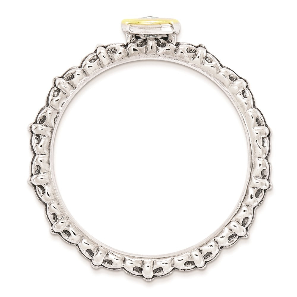 The 14K/Silver Two-Tone Sterling Silver & 14K Stackable Expressions Checker-Cut Blue Topaz Ring offers a sleek, modern look. It features a bright blue topaz stone set in a bezel, giving it a clean edge. The ring combines silver and yellow gold accents for a stylish, layered feel. Its 2.5 mm band is lightweight and easy to wear all day. Made with solid, cast quality, this stackable ring stands out with its unique checker-cut stone. The eye-catching blue topaz adds a pop of color and sparkle, making the 14K/Silver Two-Tone Sterling Silver & 14K Stackable Expressions Checker-Cut Blue Topaz Ring perfect for any jewelry collection.