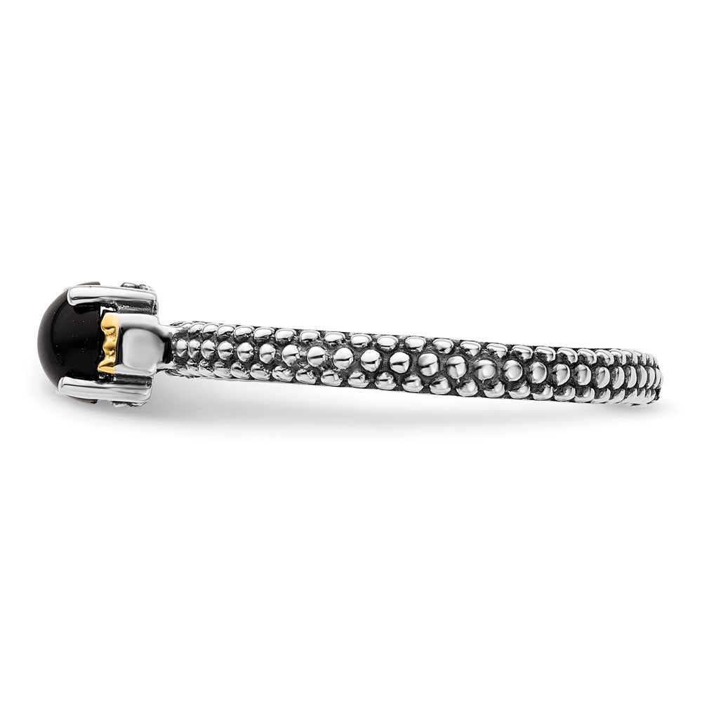 Discover the Two-Tone Sterling Silver & 14K Stackable Expressions Onyx Antiqued Ring, a perfect blend of style and quality. This ring features a sleek 2.5mm band crafted from solid 14K gold, accented with antiqued sterling silver for a unique look. A bold, round black onyx sits at the center, prong-set to ensure durability. Dyeing enhances its deep color, adding a rich touch to this stackable piece. Whether you want a subtle accent or to mix it with other rings, the Stackable Expressions Onyx Ring offers versatile charm. Elevate your jewelry game with this eye-catching piece today.
