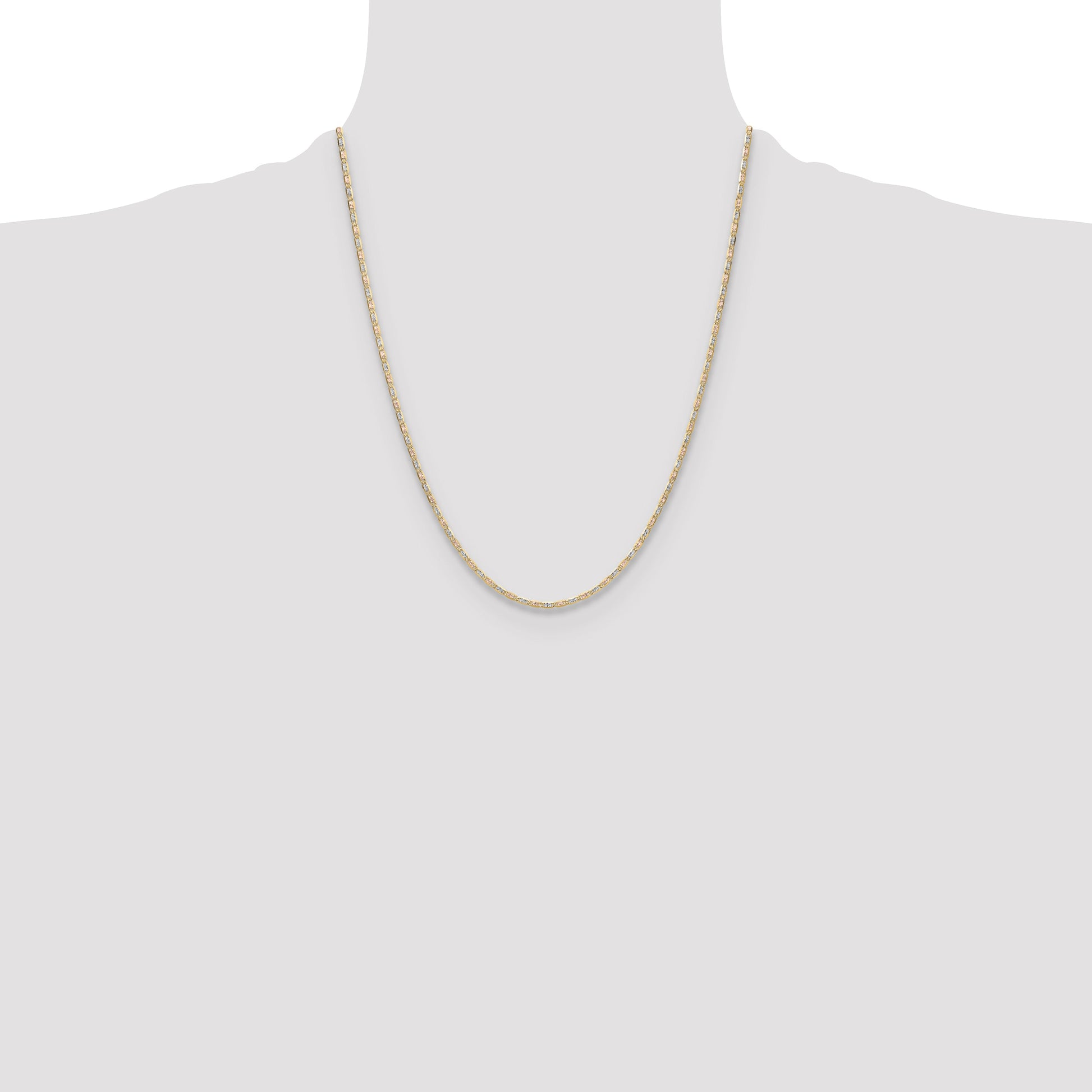 The 14K Tri-Color 2.0mm Gold Pavé Valentino Chain shines as a timeless statement piece. Crafted from pure 14-karat gold, this chain combines white, yellow, and rose gold for a beautiful tri-color design. Its intricate pavé links capture and reflect light, creating a dazzling effect. The 2.0mm chain ensures a sleek and elegant look, perfect for every outfit. The 14K Tri-Color Gold Pavé Valentino Chain stands out not just for its beauty, but also its versatility, offering a refined touch to any jewelry collection.