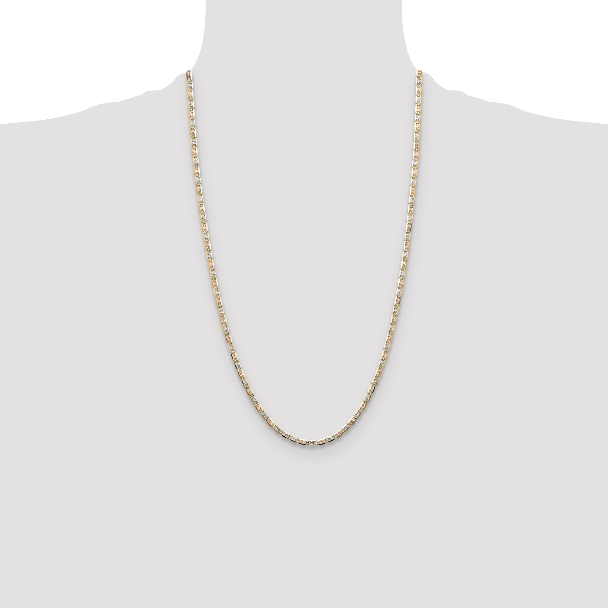 Discover the exquisite 14K Tri-Color 3.2mm Gold Pavé Valentino Chain that promises to add flair to your style. This stunning piece features tri-color gold, merging shades of yellow, white, and rose gold in a harmonious blend. The 14-karat gold ensures a perfect balance of durability and elegance. Measuring at 3.2mm, it's a versatile accessory, ideal for both casual outings and special events. Along with style, it offers comfort that lasts all day. Elevate your jewelry collection with the 14K Tri-Color 3.2mm Gold Pavé Valentino Chain, a true masterpiece in craftsmanship.