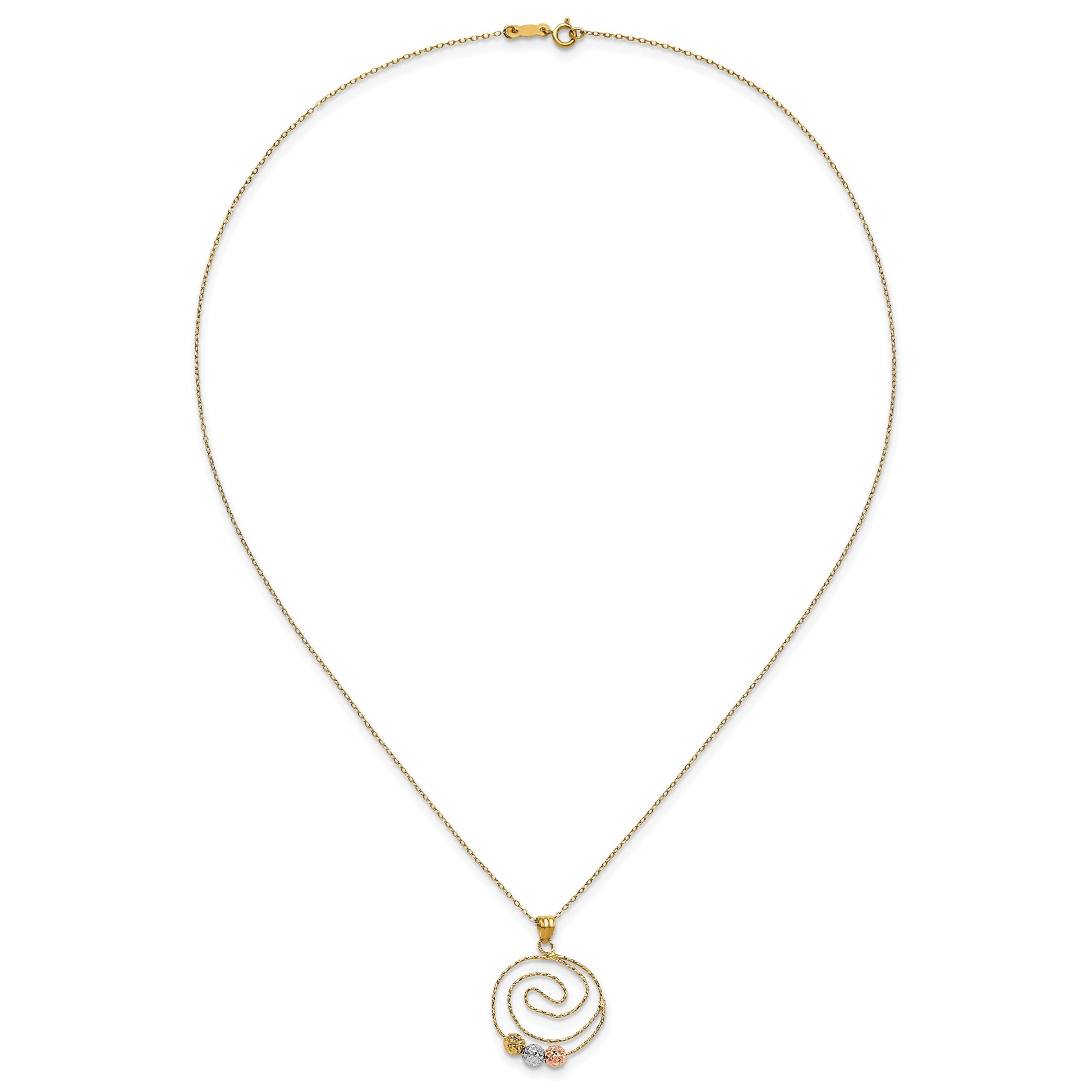 The 14K Tri-Color D/C Beads On Spiral Pendant Necklace is a dazzling piece that embodies elegance and style. Crafted from 14K gold, this necklace features a polished tri-color finish that includes yellow, white, and rose gold tones. Its 18-inch cable chain is delicate yet durable, ensuring a perfect fit every time. The diamond-cut detailing on the beads adds a touch of sparkle, making it truly unique. The pendant measures 20 mm by 20 mm, serving as a stunning focal point. Secured with a spring ring clasp, this necklace is perfect for the woman who appreciates sophistication. Indulge in the luxury of the 14K Tri-Color D/C Beads On Spiral Pendant Necklace and make any outfit stand out.