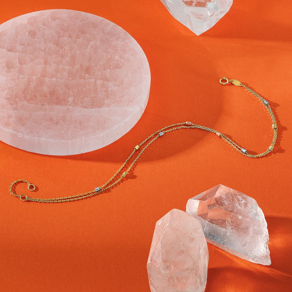 Introducing the 14K Tri-color Diamond-cut Beads Anklet, a stunning piece that adds a touch of flair to any outfit. This anklet features a beautiful blend of three gold tones, creating...