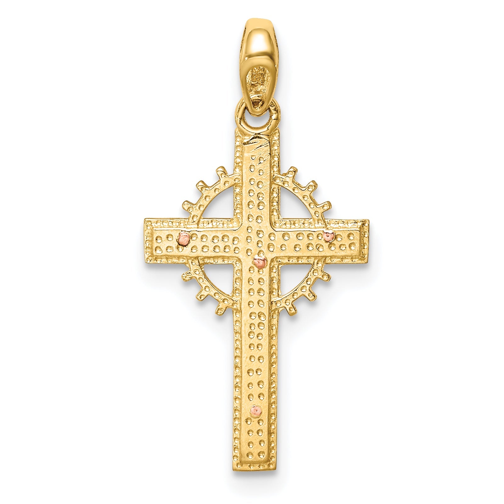 Introducing our refined 14k Two-tone Crucifix Pendant, the symbol of your strong faith. Created a polished finish, this pendant is anything but ordinary. Crafted with dedication, our pendant is made of 14K gold, ensuring the highest quality. This product showcases a unique blend of two colors, offering an appealing contrast. One of the highlights, the Cubic Zirconia stone, is synthetic yet stunning, sharpening the pendant's overall look. The pendant works as a stand-alone charm, fitting perfectly with your style. You won't overlook this solid, casted jewelry piece that sells per unit. The 14K Two-tone Crucifix Pendant is truly a timeless piece.