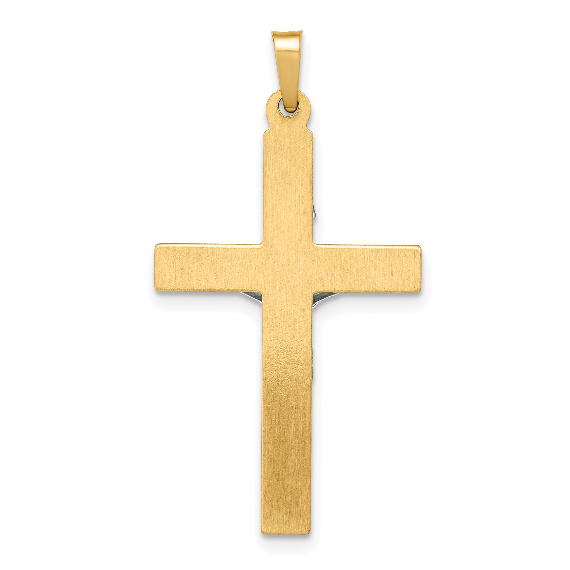 The 14k Two-tone INRI Hollow Crucifix Pendant combines elegance and faith in a stunning design. Crafted from high-quality 14k gold, this pendant shines with a polished finish that enhances its two-tone allure. Measuring 39 mm in length, it features a hollow design that adds a unique touch. The charm spans 32 mm in length and 20 mm in width, perfect for everyday wear or special occasions. With a 5 mm bail, this pendant slides easily onto your favorite chain. Show your devotion with the 14k Two-tone INRI Hollow Crucifix Pendant, a piece that speaks to the heart.
