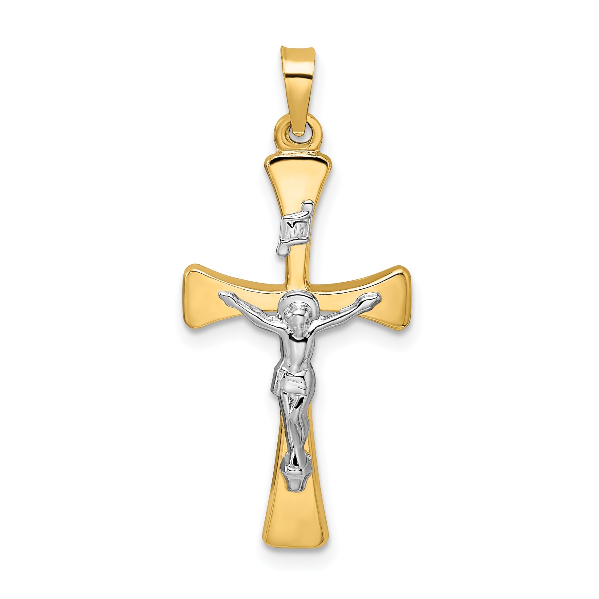 Introducing the 14k Two-tone Polished Hollow INRI Crucifix Cross Pendant, a striking piece of fine jewelry that carries deep meaning. Crafted from high-quality 14k gold, this two-tone pendant features a polished finish that shines beautifully. With a length of 32.9 mm and a width of 14.77 mm, it boasts a hollow design, making it lightweight and easy to wear. This unisex pendant is perfect for anyone seeking a stylish yet profound accessory. The 14k Two-tone Polished Hollow INRI Crucifix Cross Pendant makes a meaningful statement, ideal for everyday wear or special occasions.