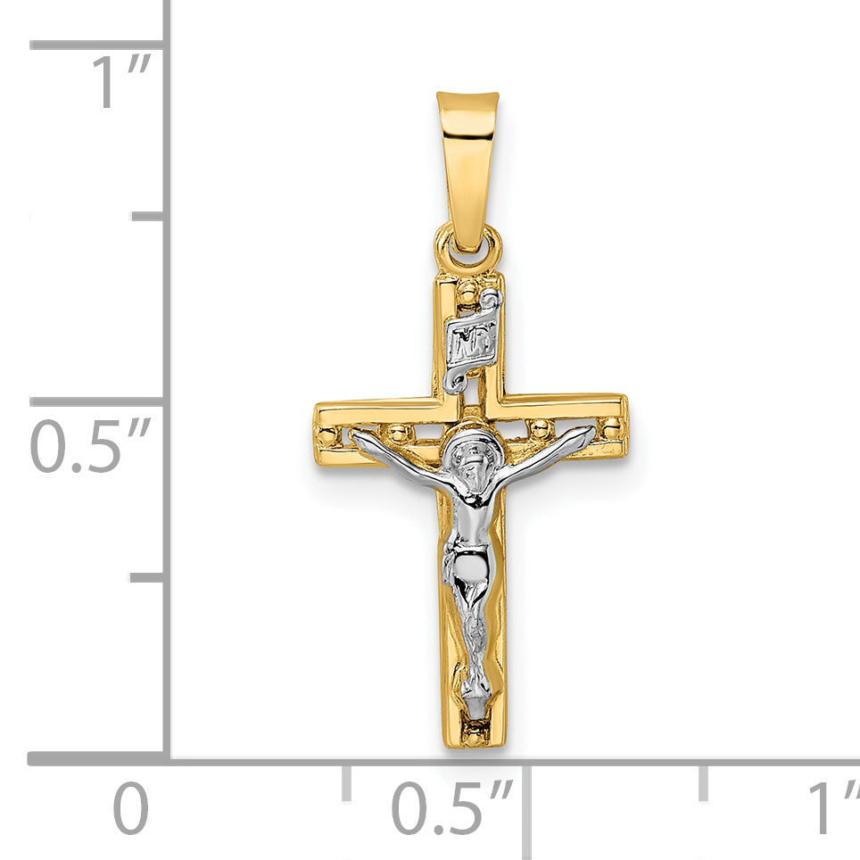 Introducing the stunning 14k Two-Tone Polished Solid INRI Crucifix Pendant. This exquisite piece features a sleek polish that highlights its beautiful two-tone gold design. With a length of 24.2 mm and a charm width of 11.55 mm, it makes a bold statement while remaining a timeless accessory. Its solid structure ensures durability, while the unisex style appeals to everyone. This pendant is perfect for adding a touch of faith to your outfit. The 14k Two-Tone Polished Solid INRI Crucifix Pendant is an elegant choice for everyday wear or special occasions.
