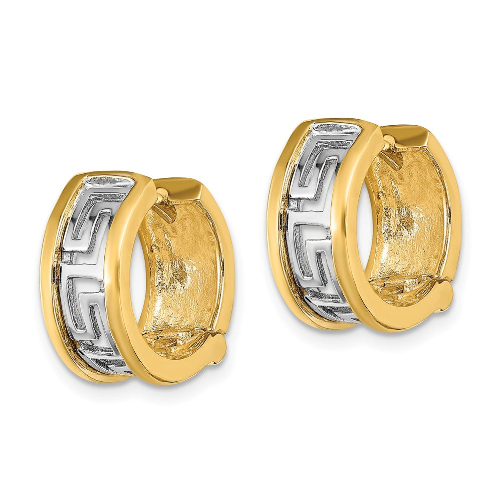 Discover the exquisite charm of our 14K Two-Tone Cut-Out Greek Key Hinged Hoop Earrings. These earrings showcase a perfect blend of polished and brushed finish, adding a touch of elegance to any outfit. The intricate Greek key pattern is cut out to allow light to shine through, creating a captivating look. Crafted from 14K gold, these hoop earrings offer both durability and beauty, while the two-tone design stands out as a classic choice. The earrings feature a secure post, notch, and lock closure, making them ideal for daily wear. Elevate your style with this stunning pair of 14K Two-Tone Cut-Out Greek Key Hinged Hoop Earrings.