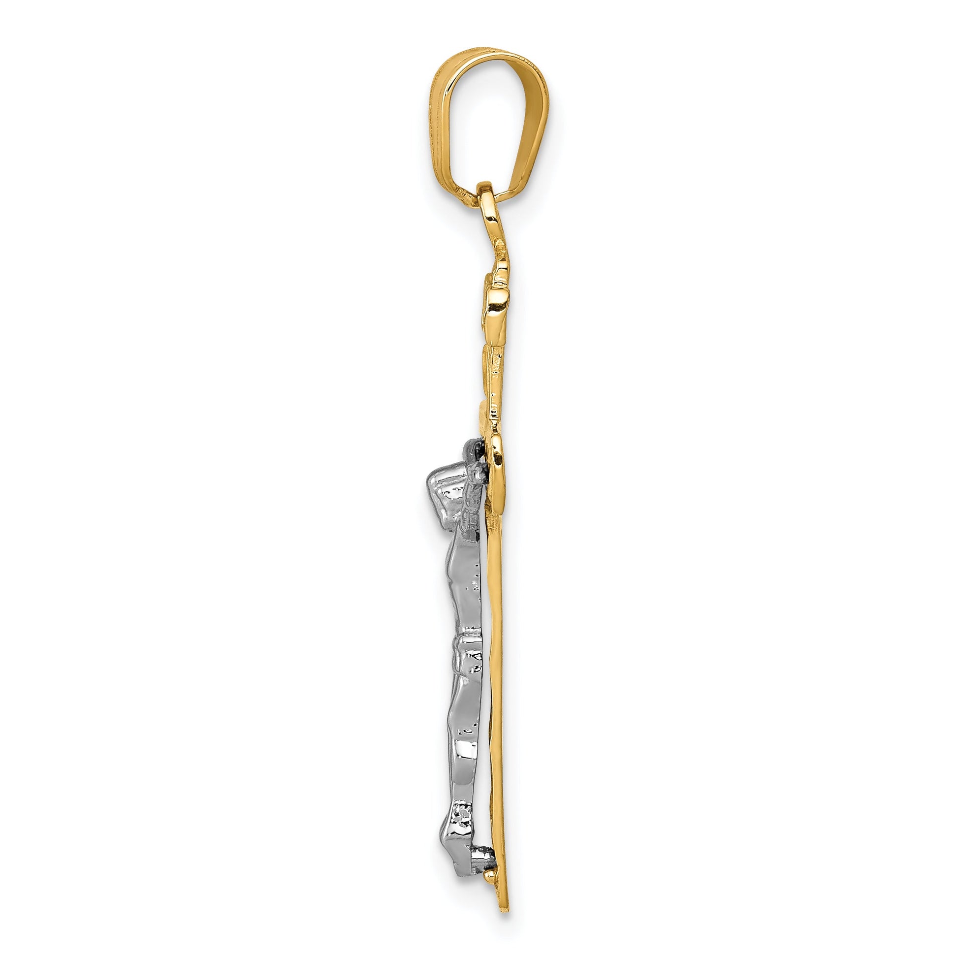 Discover elegance with our 14K Two-Tone Diamond-Cut Lattice Cross with Crucifix Pendant. Crafted from high-quality 14K gold, this stunning piece showcases a polished finish, adding a rich luster. Measuring 33mm in length and 16mm in width, this pendant deftly balances intricate design elements. The diamond-cut lattice texture enhances its classic appeal, while the two-tone color lends a modern twist. Ideal for both daily wear and special occasions, the 14K Two-Tone Diamond-Cut Lattice Cross with Crucifix Pendant makes a captivating addition to any fine jewelry collection.
