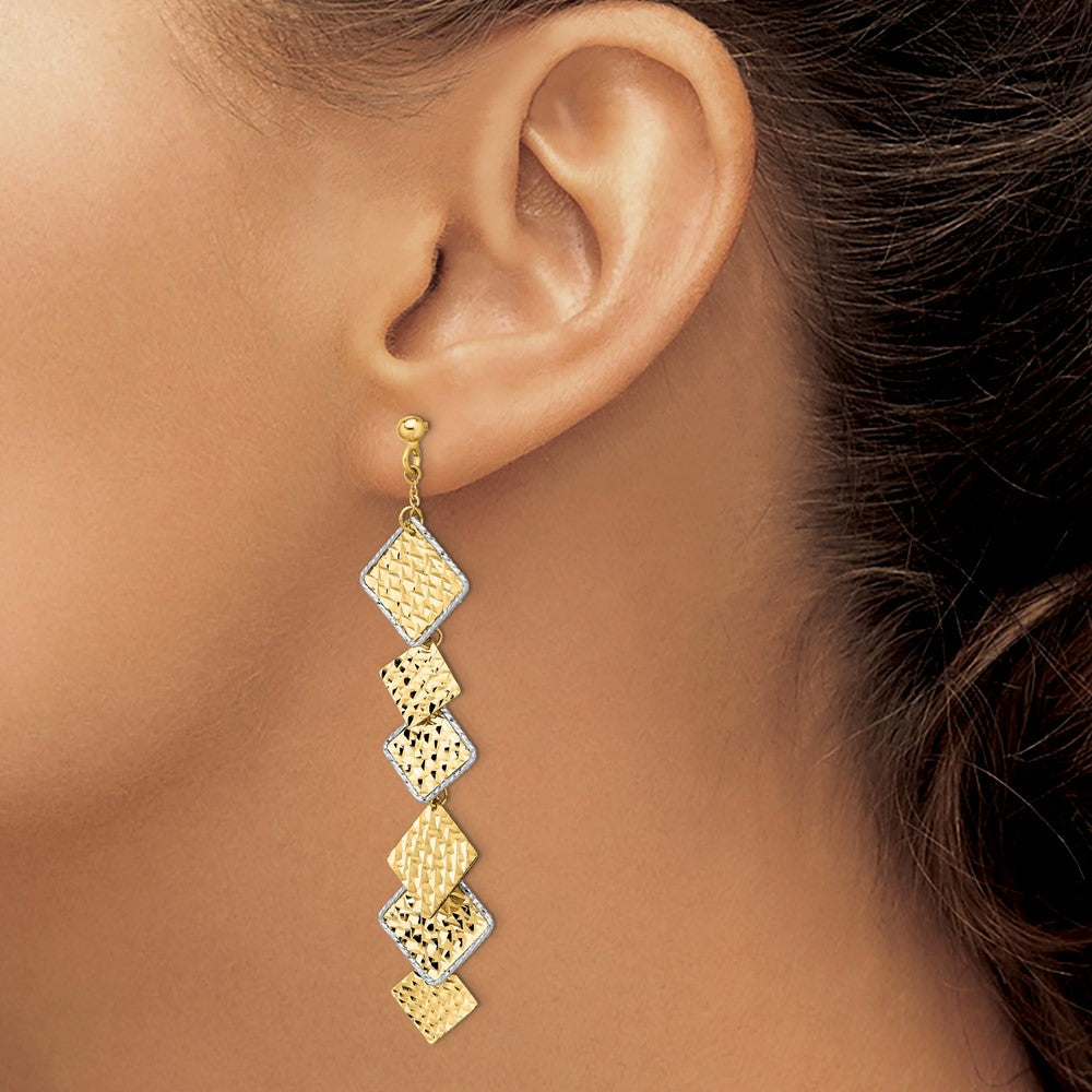 Elevate your look with the stunning 14K Two-Tone Polished and Brushed D/C Post Dangle Earrings. Crafted from solid 14K gold, these earrings blend shiny polish with sleek brushed finishes, creating a stylish contrast. Measuring 67 mm long, they feature a drop and dangle design that adds movement and charm to any outfit. The post and push-back closure ensures a secure fit, while the diamond-cut texture boosts their sparkle. These jewelry pieces are built to last, backed by a lifetime guarantee. Perfect for women who want to make a statement, the 14K Two-Tone Polished and Brushed D/C Post Dangle Earrings combine quality with eye-catching style.